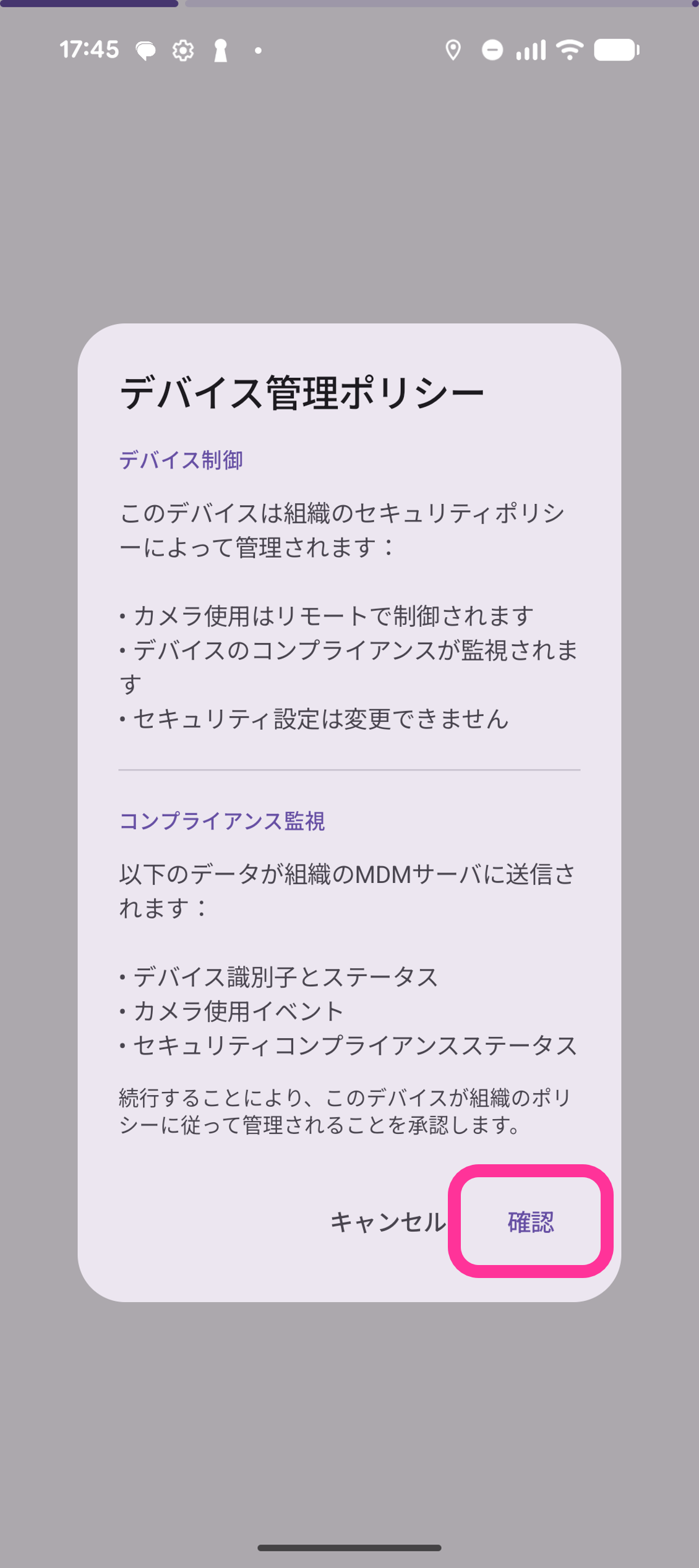 - 「デバイス管理ポリシー」画面が表示されますので「確認