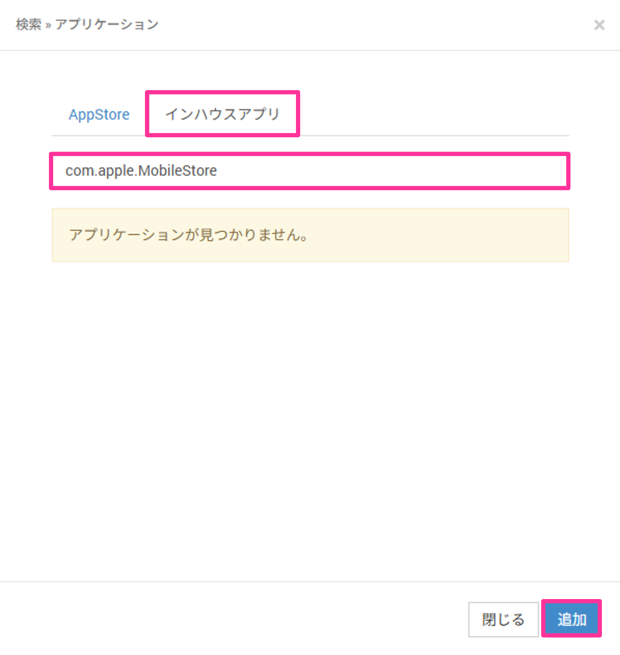 「インハウスアプリ」タブを選択し、アプリケーション名を入力して検索します。