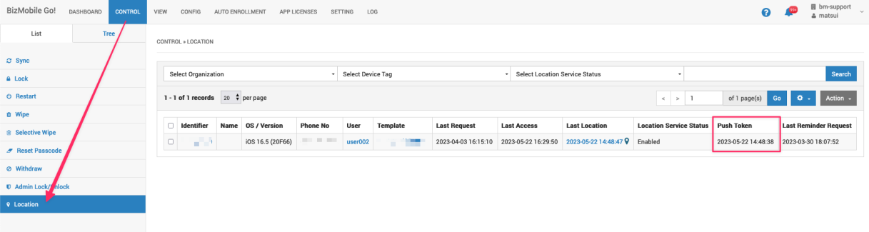 To do so, go to OPERATION > Location and check the "Push Token" section.