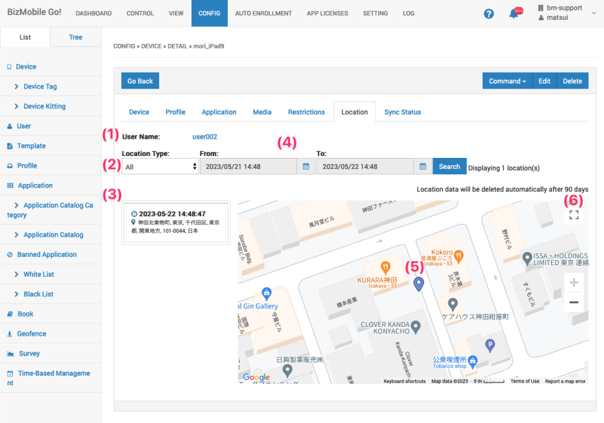 (1) User Name: click to go to User detail page(2) Location Type: You can narrow down the displayed history based on the type of location information retrieval.