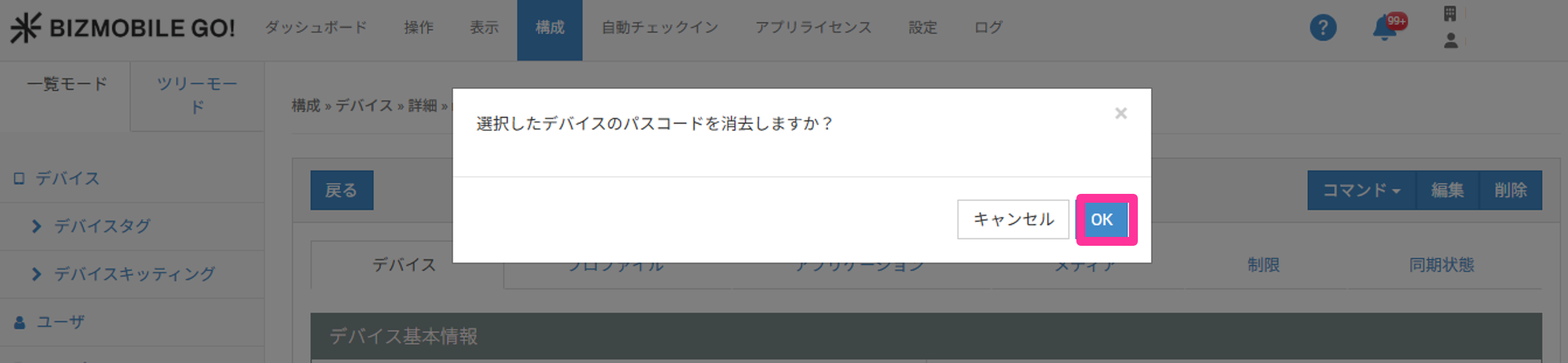 - 【構成】→【デバイス】でパスコード消去を実行するデバイスの管理番号をクリックします。