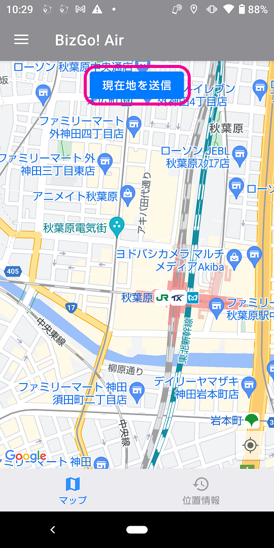 「現在地を送信」をタップすると、デバイスから管理画面(サーバ)へ位置情報を送信できます。