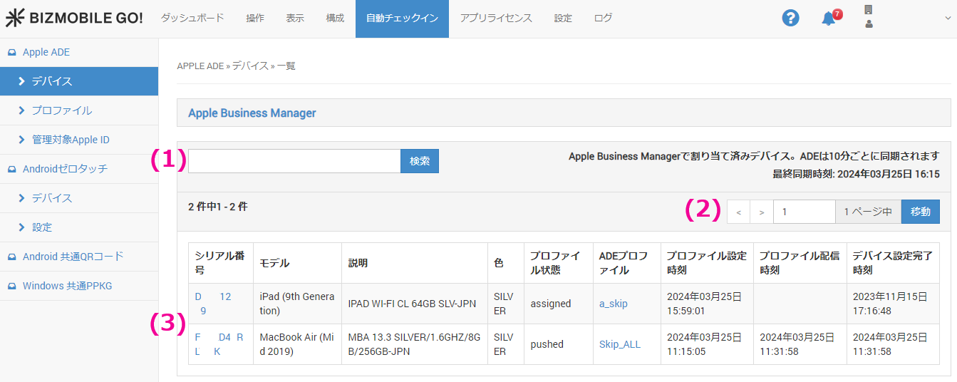 登録したADEデバイスは、BizMobile Go!のADEデバイス画面に一覧表示されます。ADEデバイス画面は、トップメニューの【自動チェックイン】から確認できます。