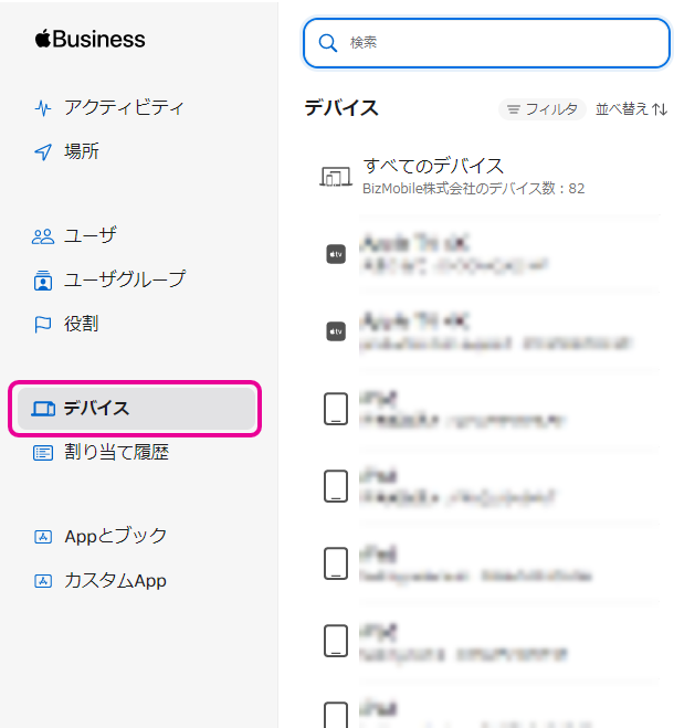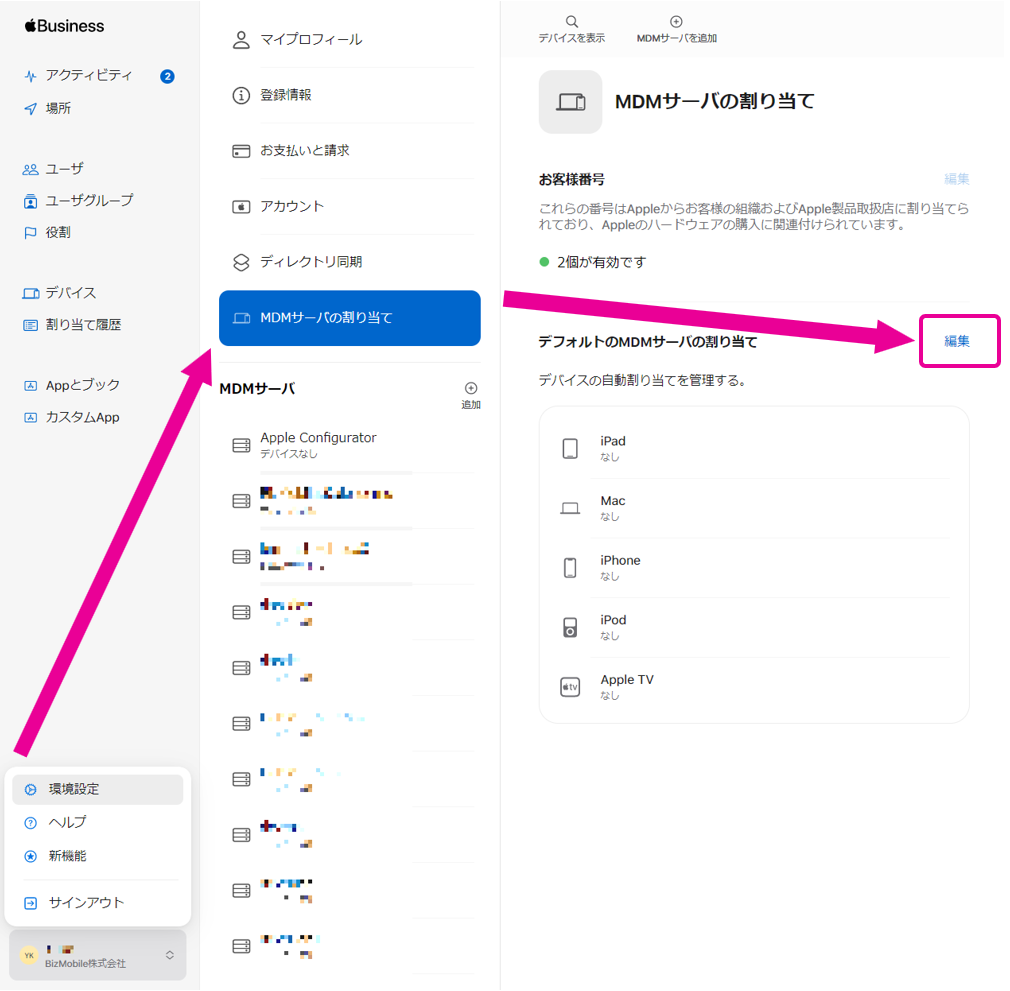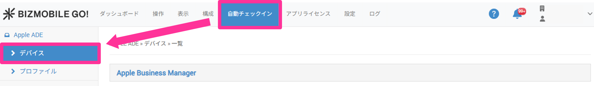 ADEデバイスをBizMobile Go!で使用できるようにするには、Apple Business Manager から割り当て作業が必要です。
