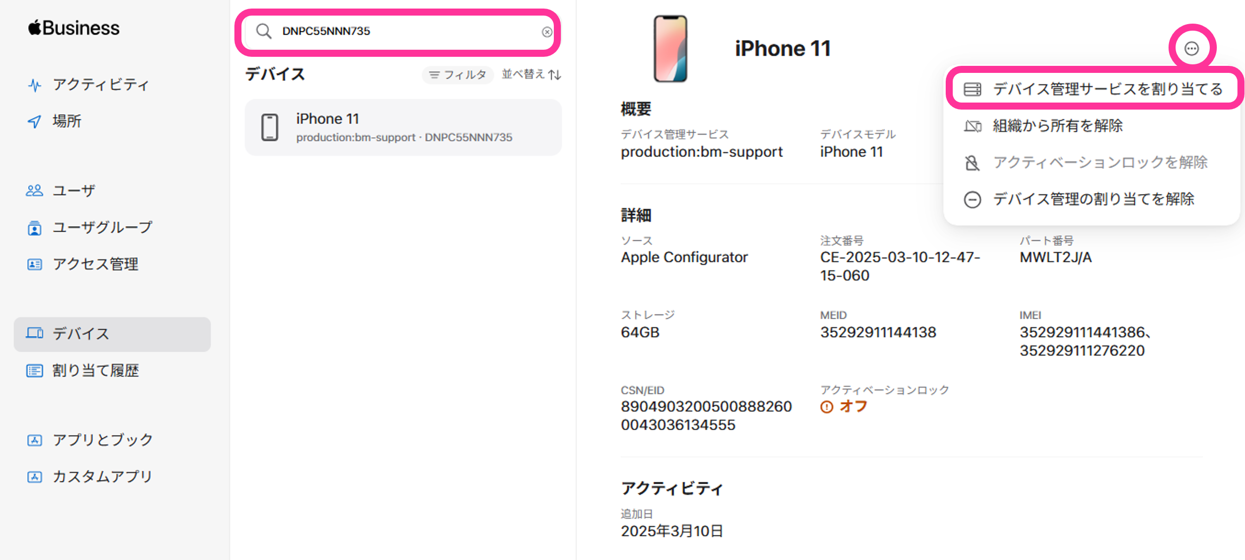 画面上部の検索窓にシリアル番号を入力し、MDMサーバへ割り当てるデバイスを絞り込みます。