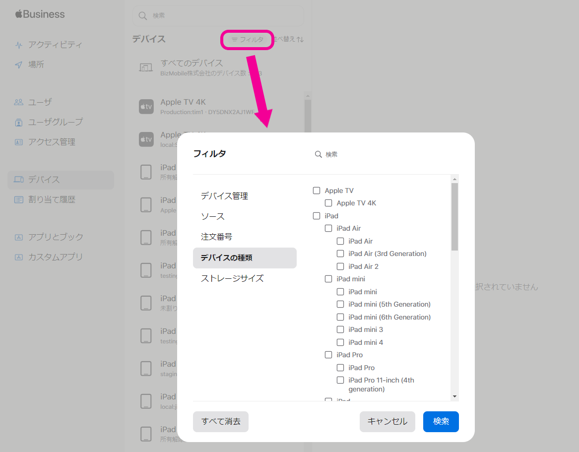 画面上部の検索窓の下のフィルタをクリックし、デバイス注文番号や、デバイスの種類等で、MDMサーバへ割り当てるデバイスを絞り込みます。