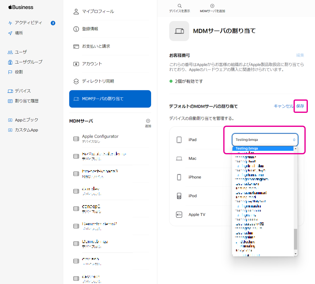 続いて、真ん中のメニューからMDMサーバの割り当てをクリックすると、設定画面が右側に展開されます。