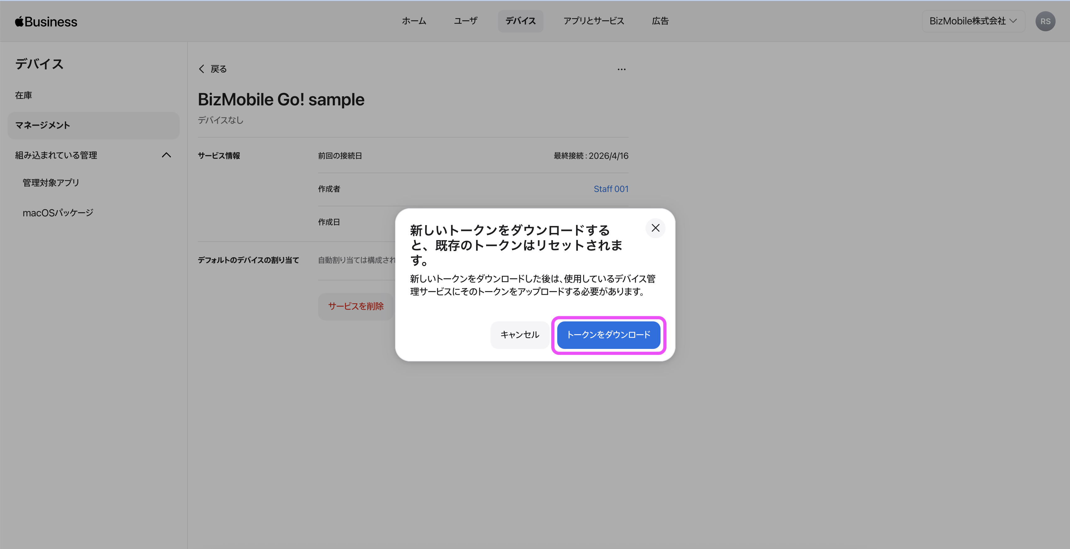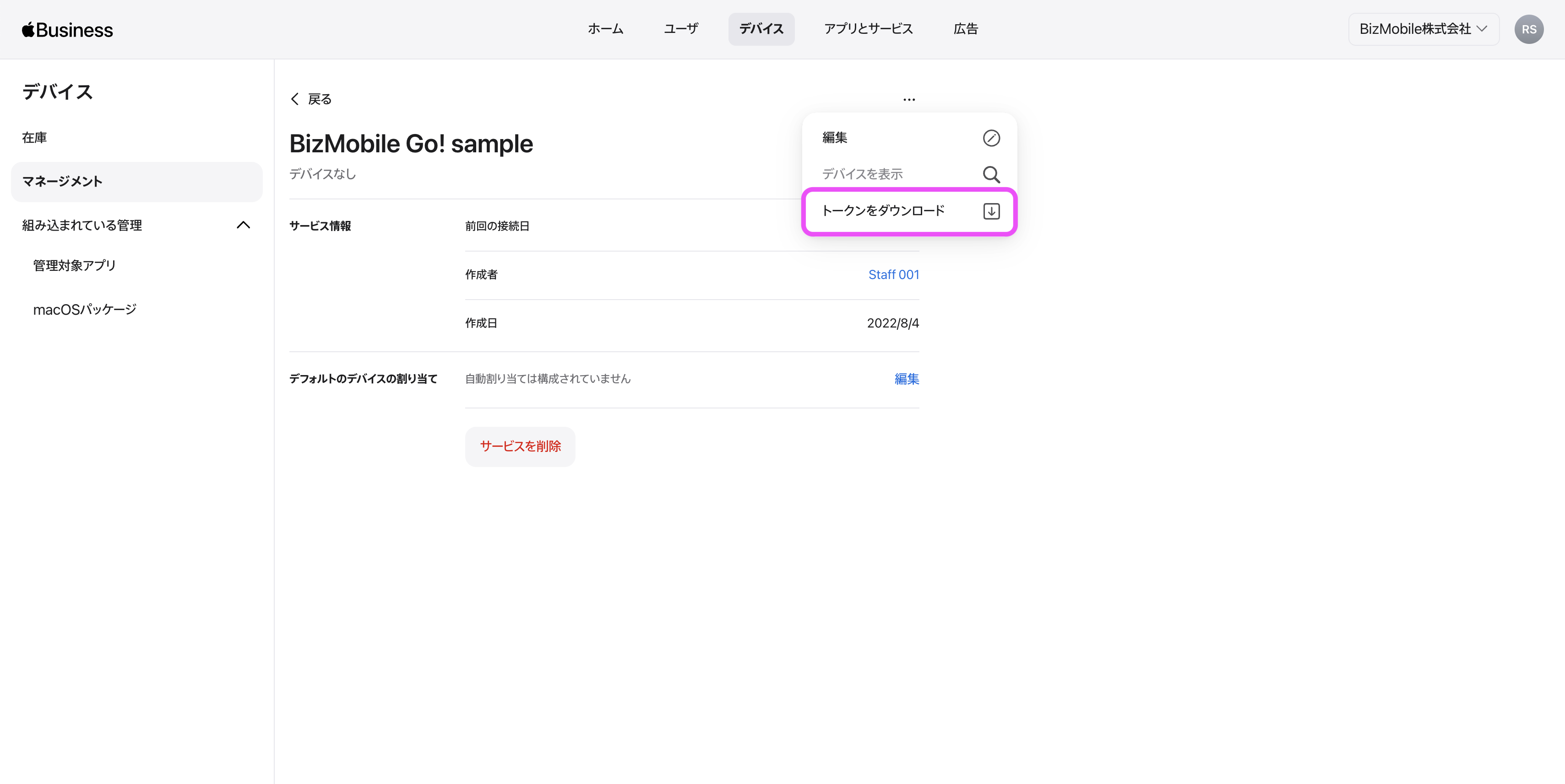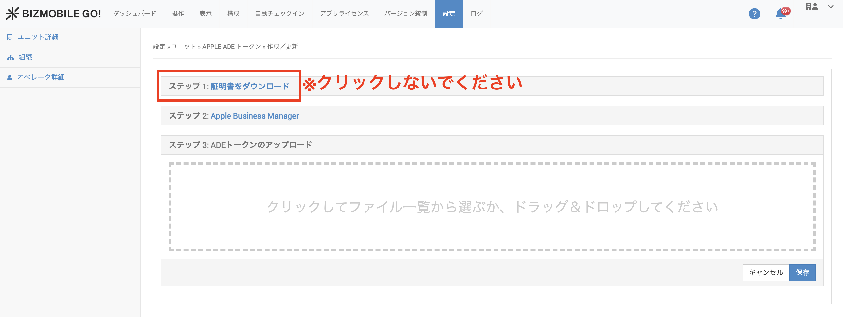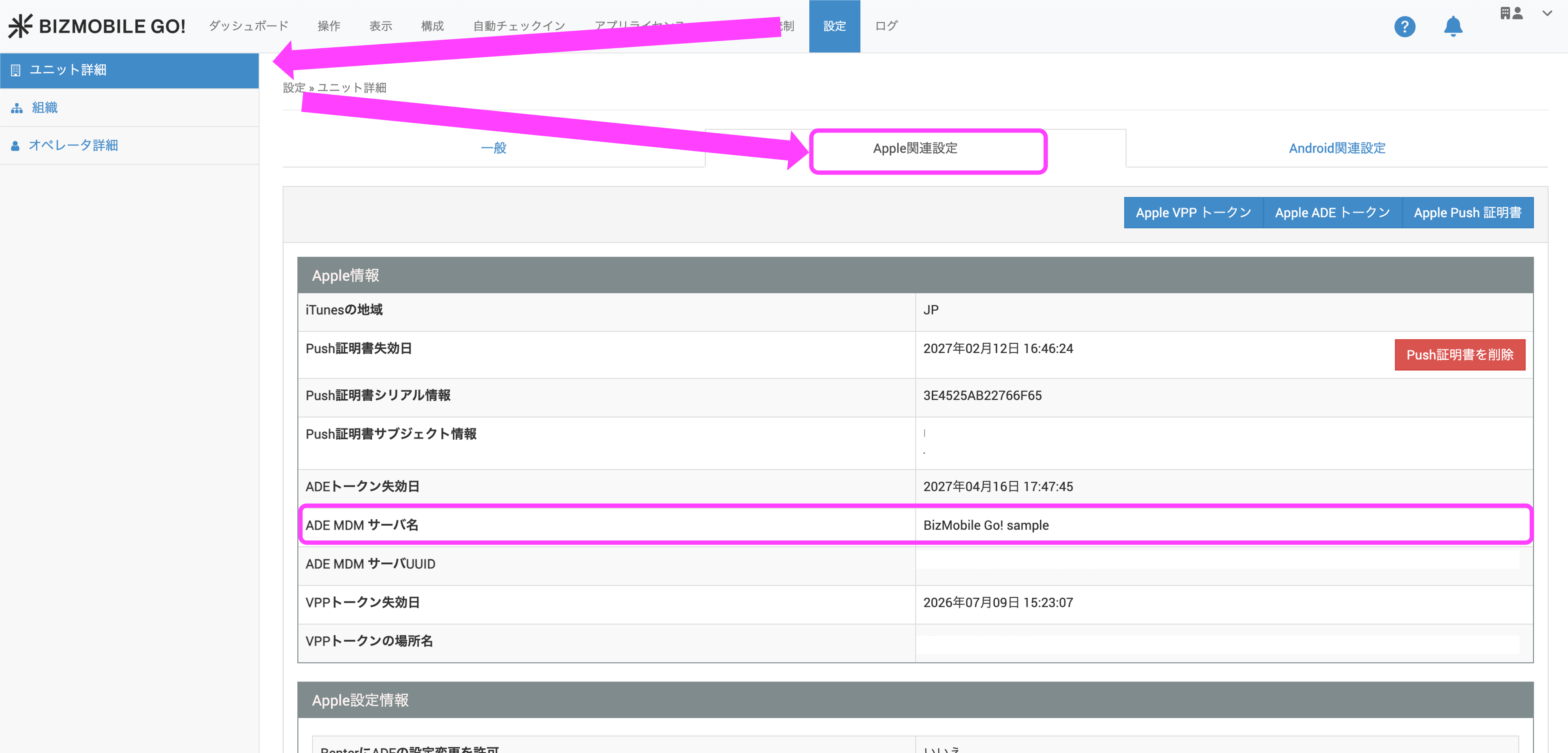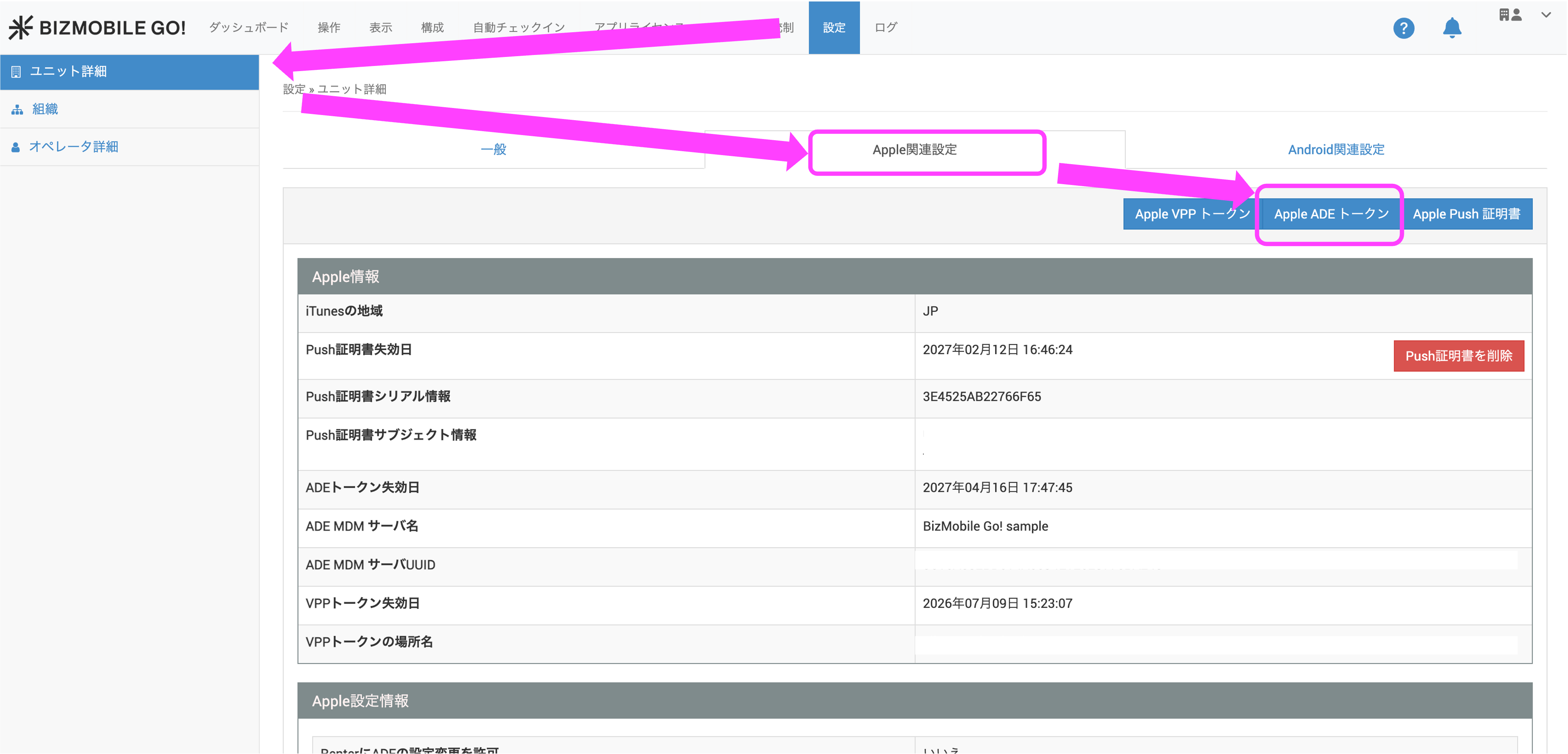 | 8.BizMobile Go!管理画面に戻り、設定→ユニット詳細→Apple 関連設定→Apple ADEトークン をクリックします。 | ![]() |