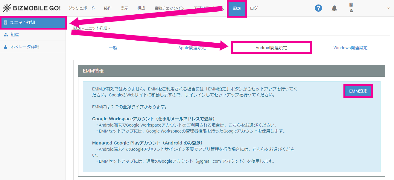 1. 【設定】→【ユニット詳細】→Android関連設定→[EMM設定]をクリックします。