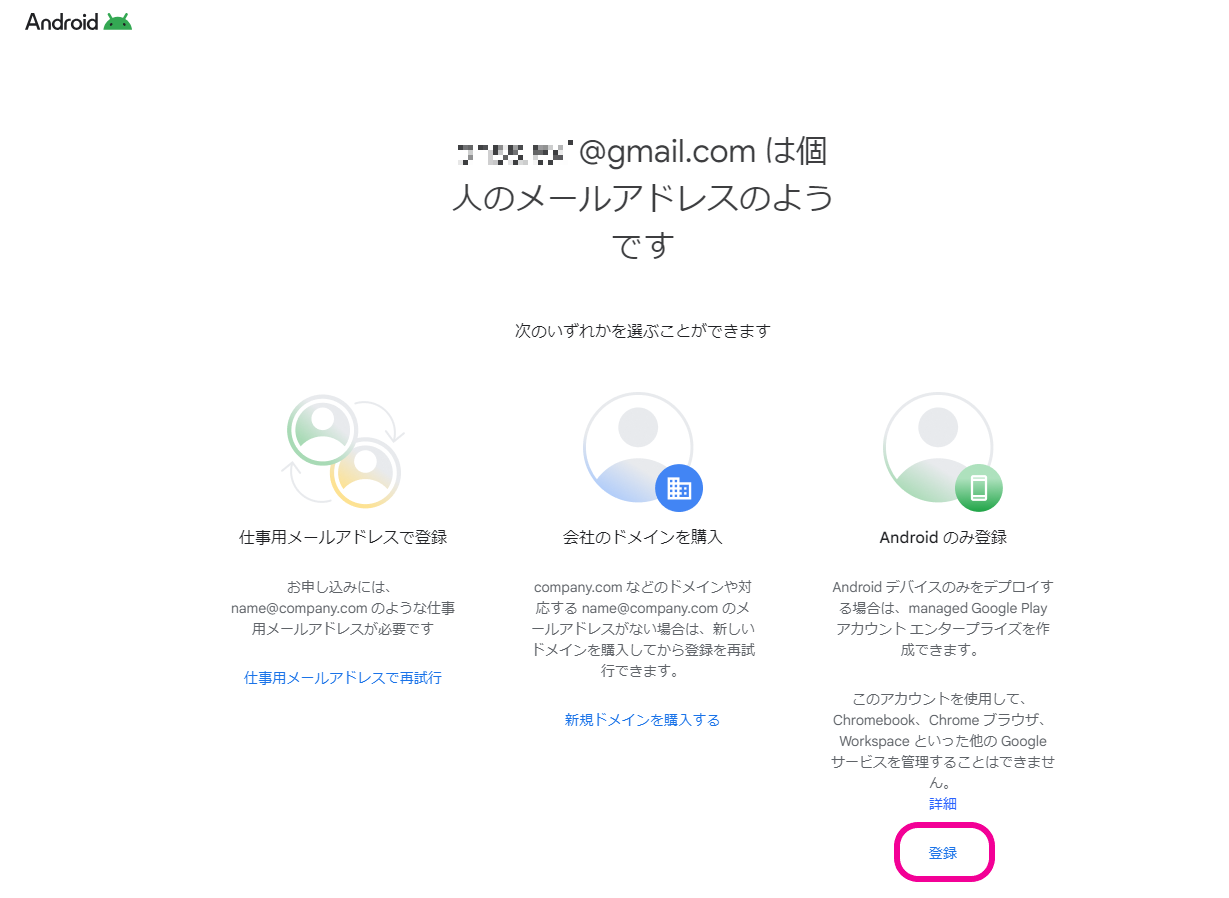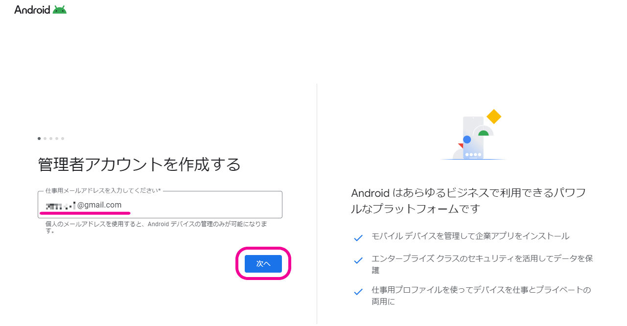以下のEMMの登録手順では、Gmail のメールアドレスを使用します。Gmail のメールアドレスは EMM 管理者のアカウントとして登録されますので、個人で使用しているもの、仕事で使用しているものは避け、EMM管理用として新規に作成してご利用ください。