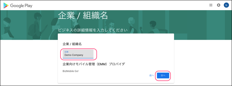 5. 企業/組織名を入力し、[次へ]をクリックします。