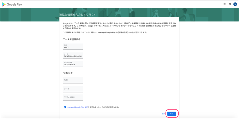 6. 連絡先情報を入力し、Managed Google Play契約を確認後、チェックを入れ、[確認]をクリックします。※EU担当者の欄への記入は不要です。