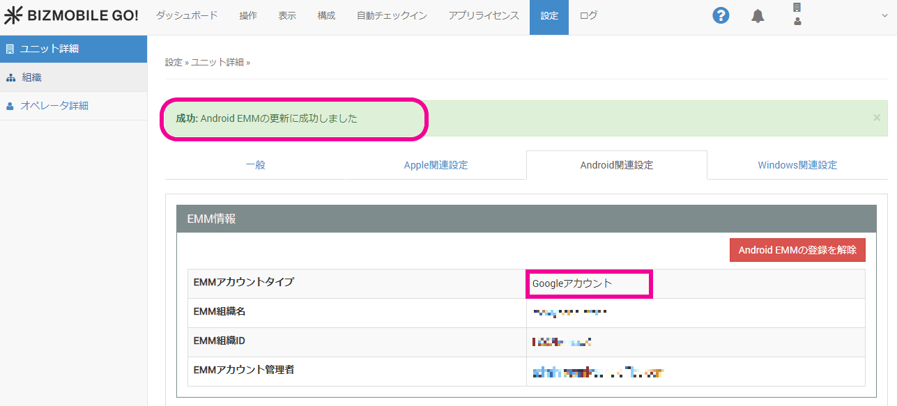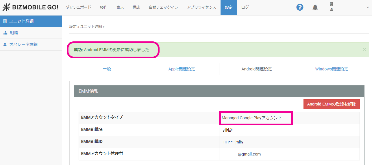 8. Android EMMの更新に成功しましたと表示され、EMMアカウントタイプGoogleアカウントと表示されれば完了です。
