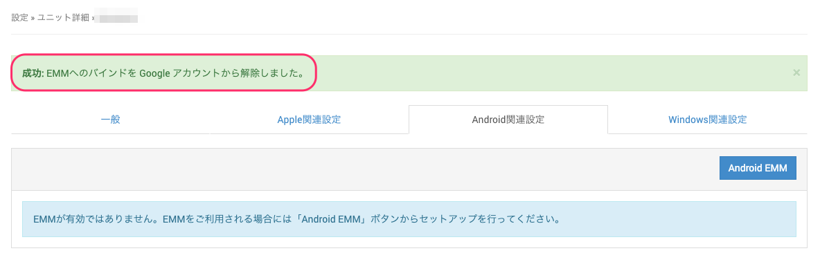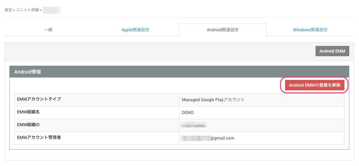 1. 【設定】→【ユニット詳細】→Android関連設定→[Android EMMの登録を解除]をクリックします。