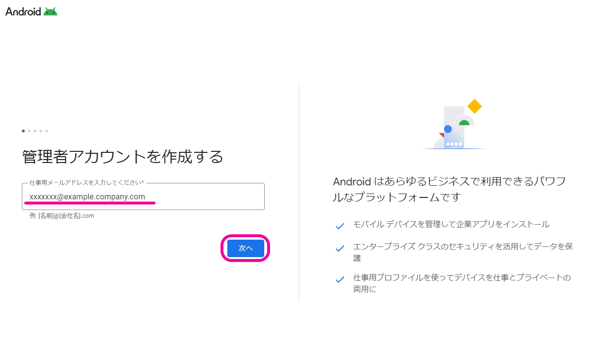 以下のEMMの登録手順では、Google Workspaceの管理者アカウントを使用します。