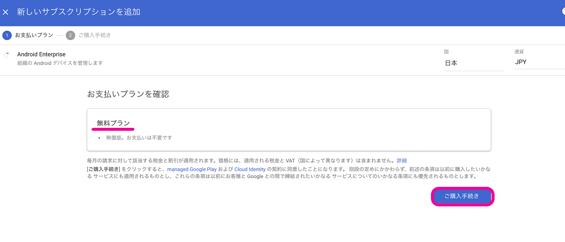 4. 無料プランとなっていることを確認しご購入手続きをクリックします。