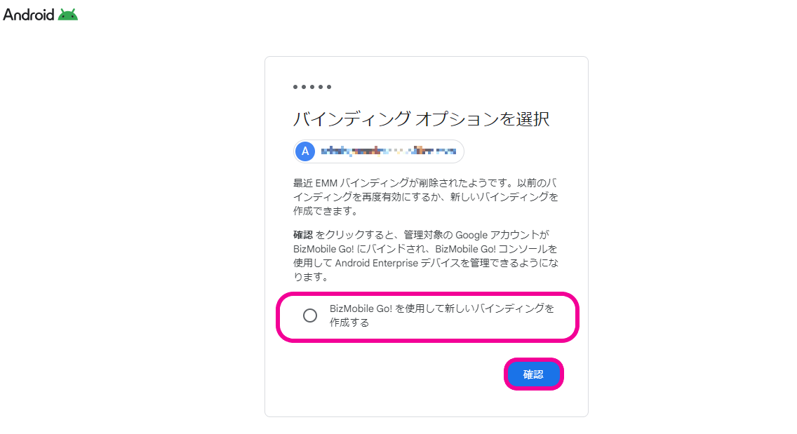6. BizMobile Go!を使用して新しいバインディングを作成するを選択して確認をクリックします。