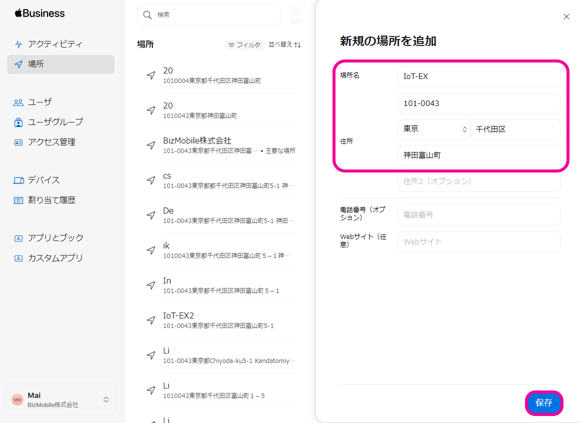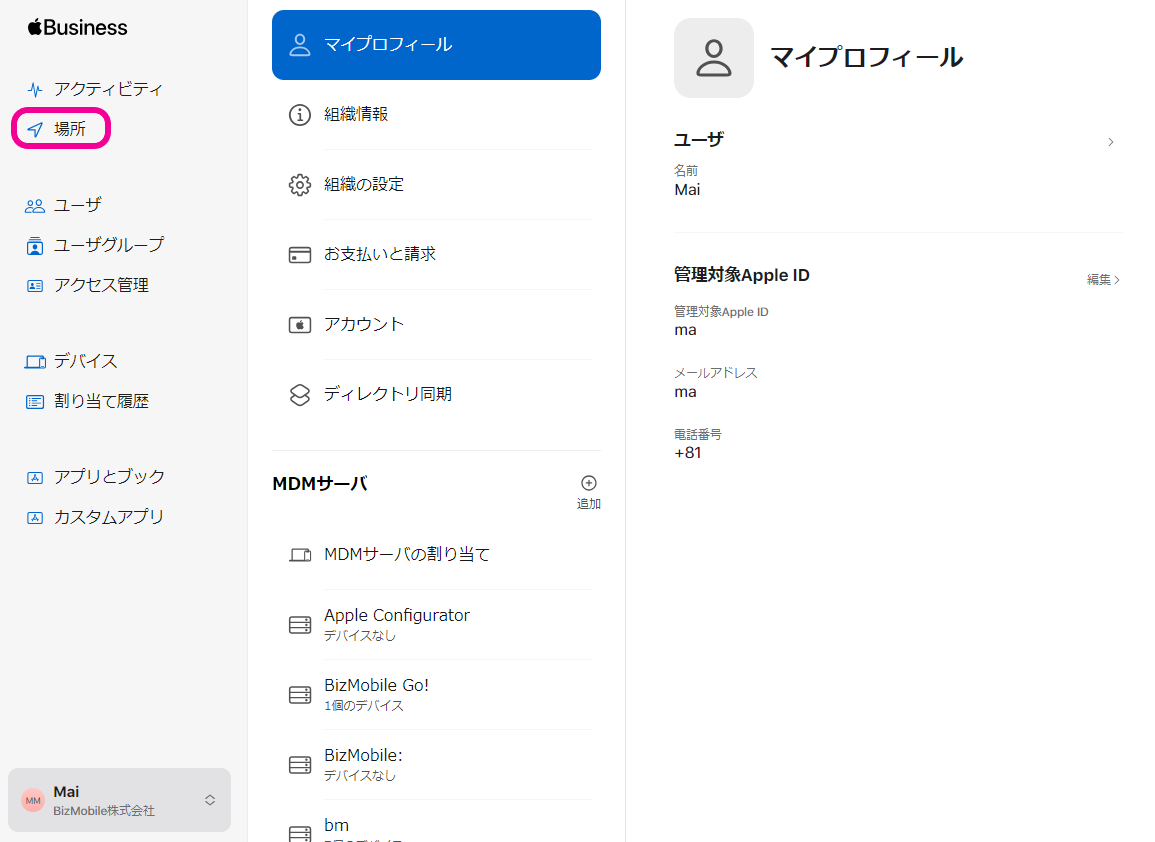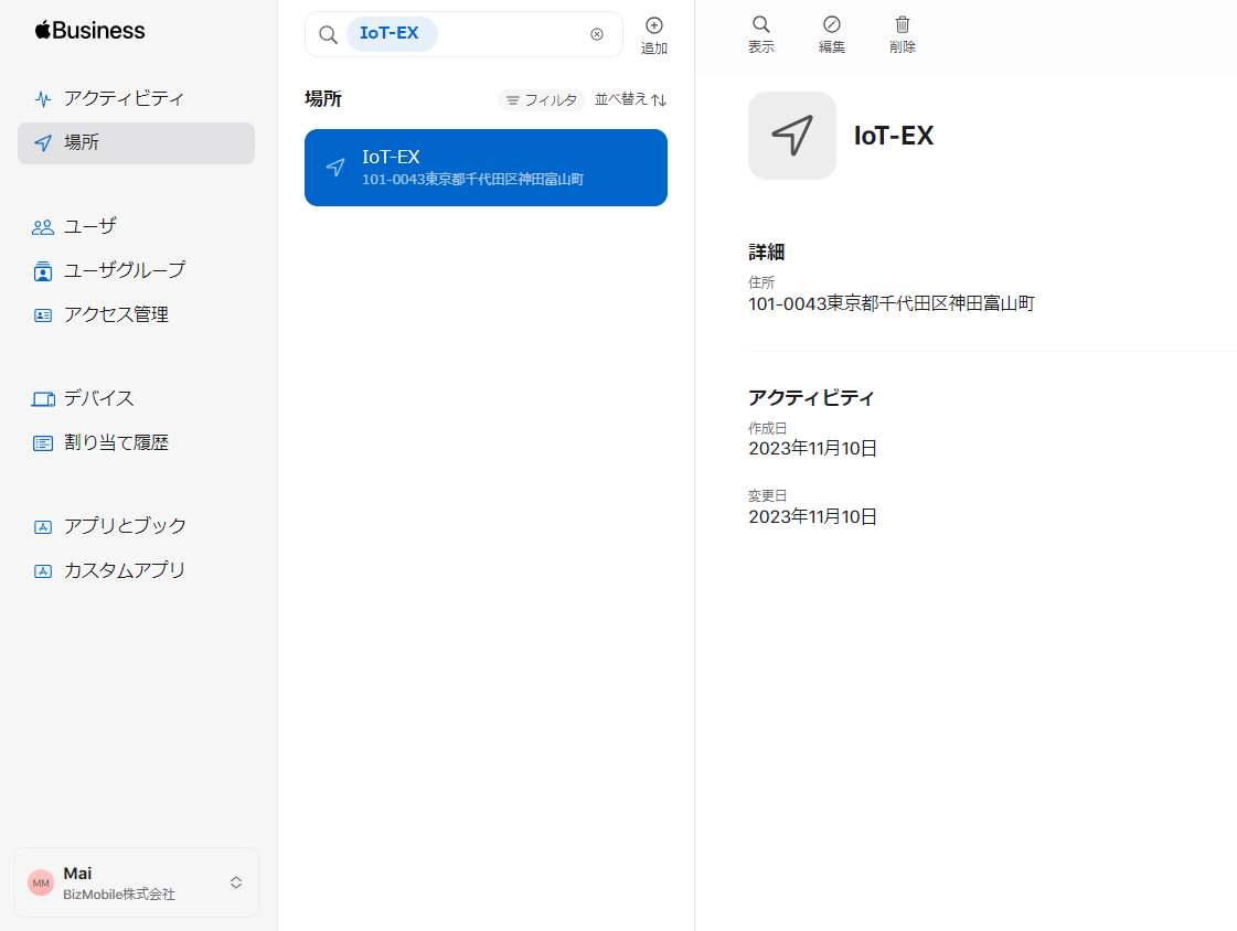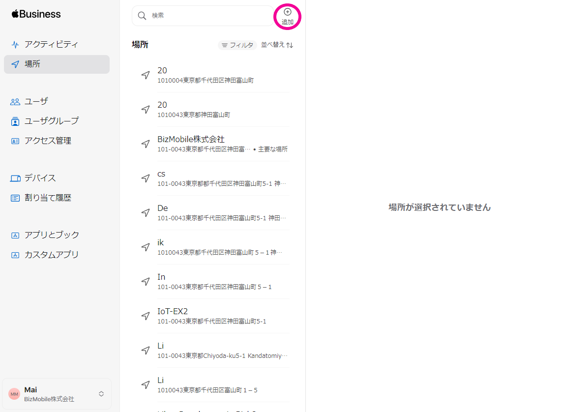 場所を作成するApple Business Managerの場所(ロケーション)機能を利用することで、場所単位でVPPトークンを発行することが可能です。
