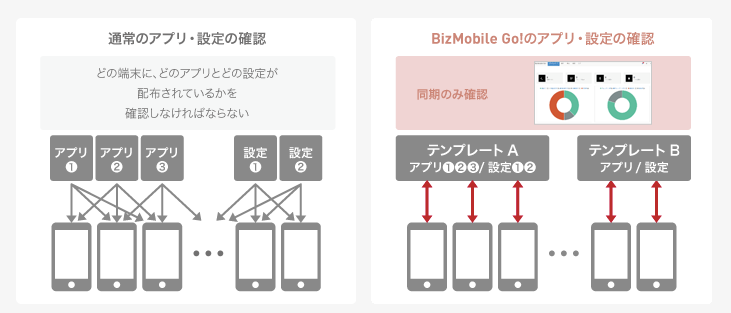 一般的なMDMは、どの端末に何を配付するか、個別に指定し、いちいち確認する必要がありました。また、配付されていない場合には、何度も再送作業を行う必要もあり、数や拠点が増えると、管理不能になるほど複雑になってしまいました。