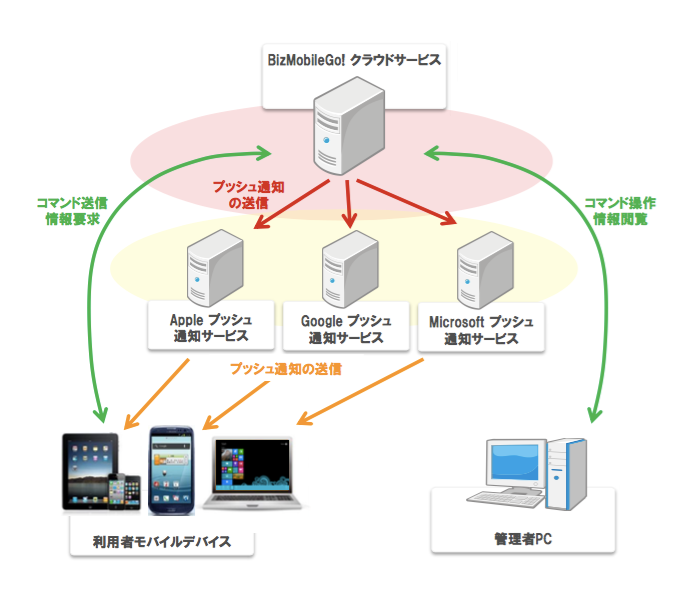BizMobile Go! は、モバイルデバイスをネットワーク経由で一括管理し、安心して利用できる環境をご提供します。 BizMobile Go! のデバイス管理によって、複数デバイスをリモートで一括設定、情報を収集することで容易なデバイス管理を実現します。