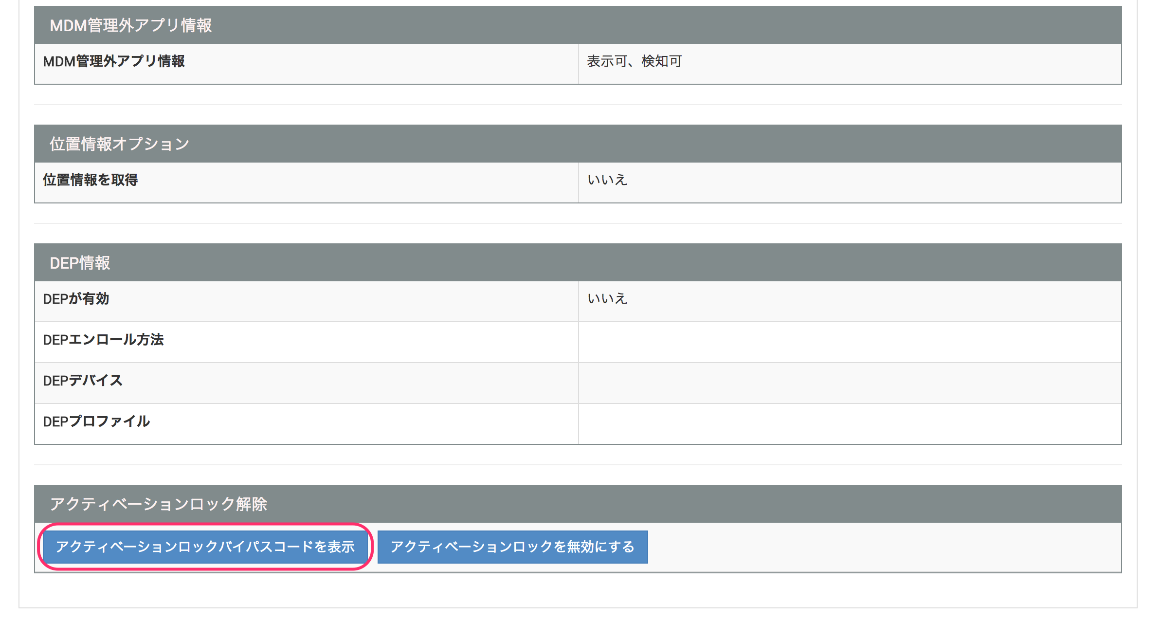 デバイス詳細画面「アクティベーションロック解除」欄、[アクティベーションロックバイパスコードを表示]をクリックします。
