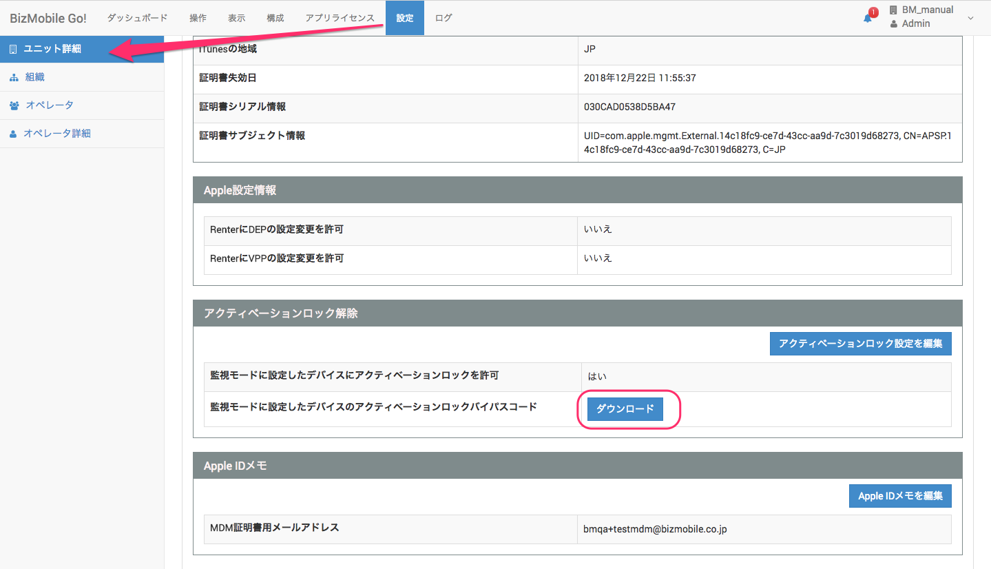 【設定】→【ユニット詳細】→「Apple関連情報」の「アクティベーションロック解除」欄内、[ダウンロード]をクリックします。
