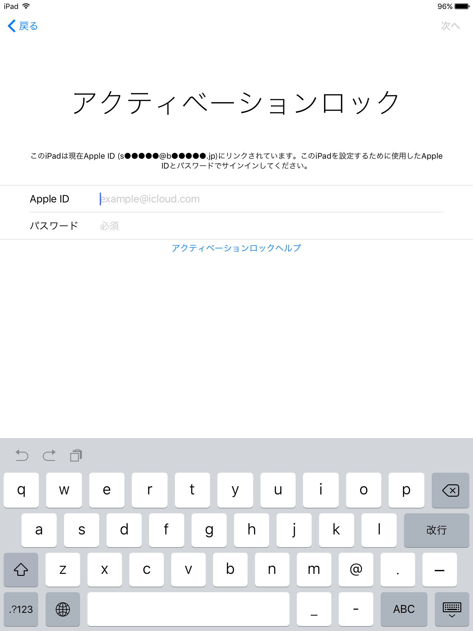 デバイス上、アクティベーションロック画面にて、Apple IDを空欄、パスワード欄にBizMobile Go!で取得したアクティベーションロックバイパスコードを入力します。