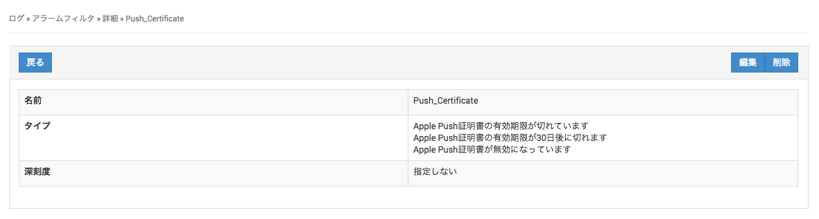 アラームフィルタ名がリンクになっているので、クリックをするとアラームフィルタの詳細ページに飛ぶことができます。