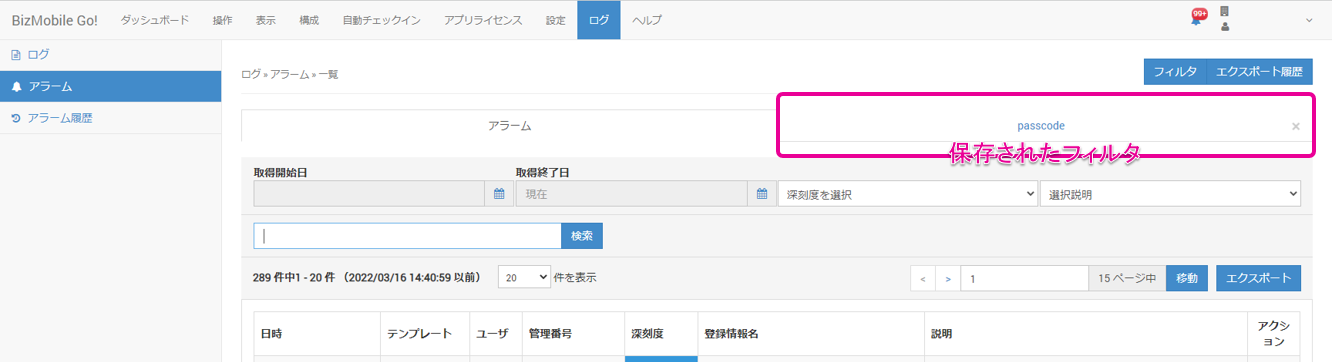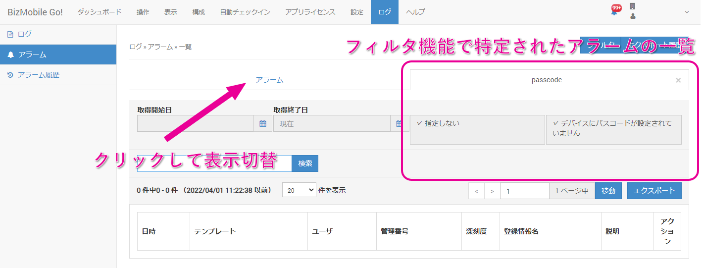 1. 【ログ】→【アラーム】から[フィルタ]をクリックします。