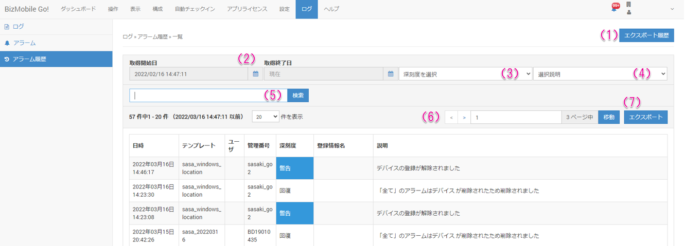 【ログ】→【アラーム履歴】アラームの履歴を表示。