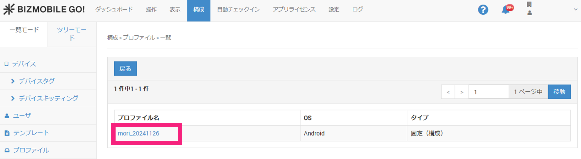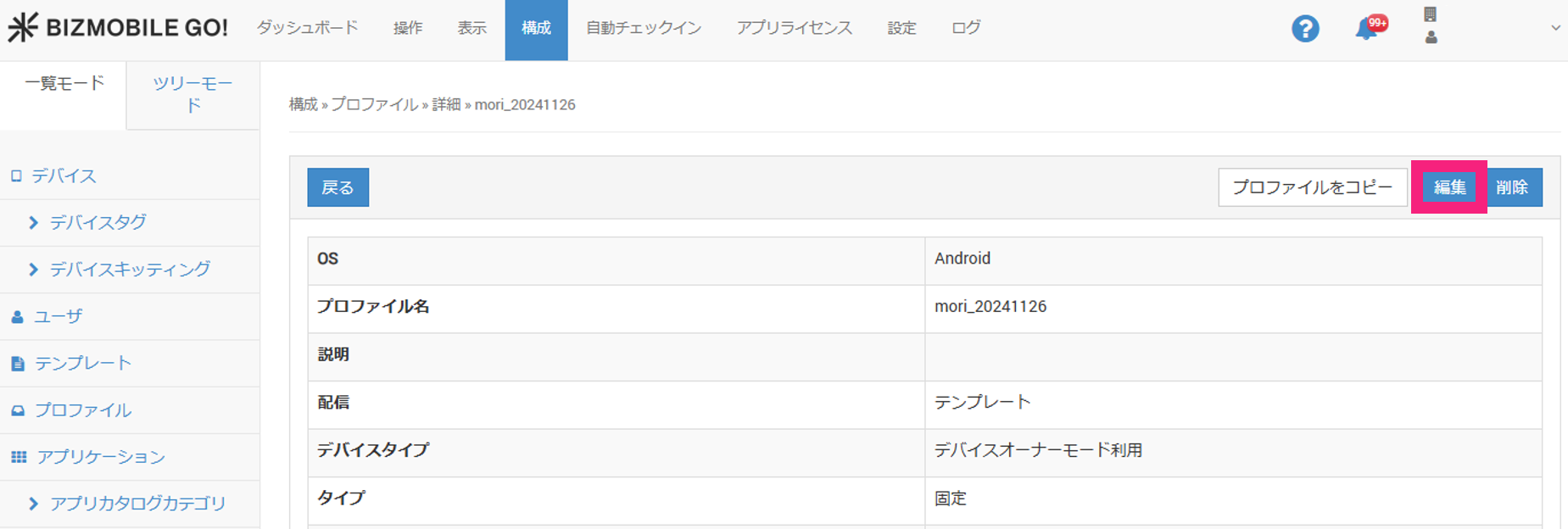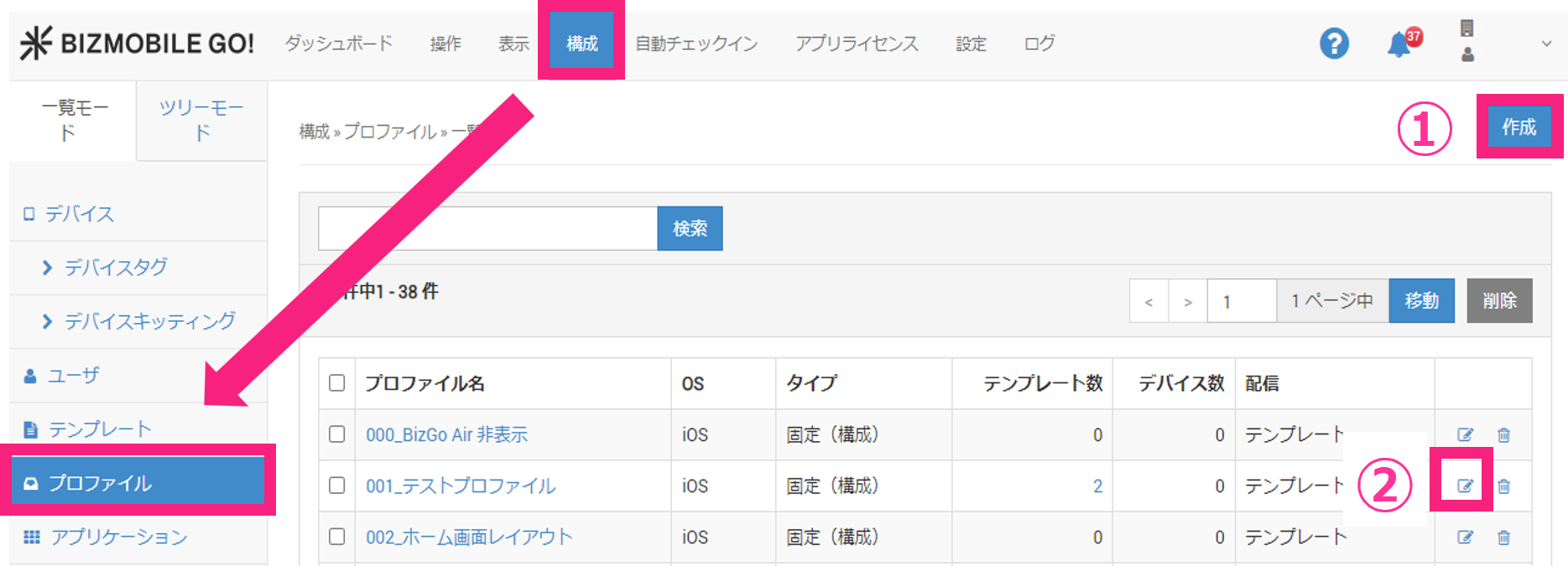 構成 > プロファイル で、 新規作成の場合は、①の作成、既存プロファイルの場合は、②の編集アイコンクリックします。