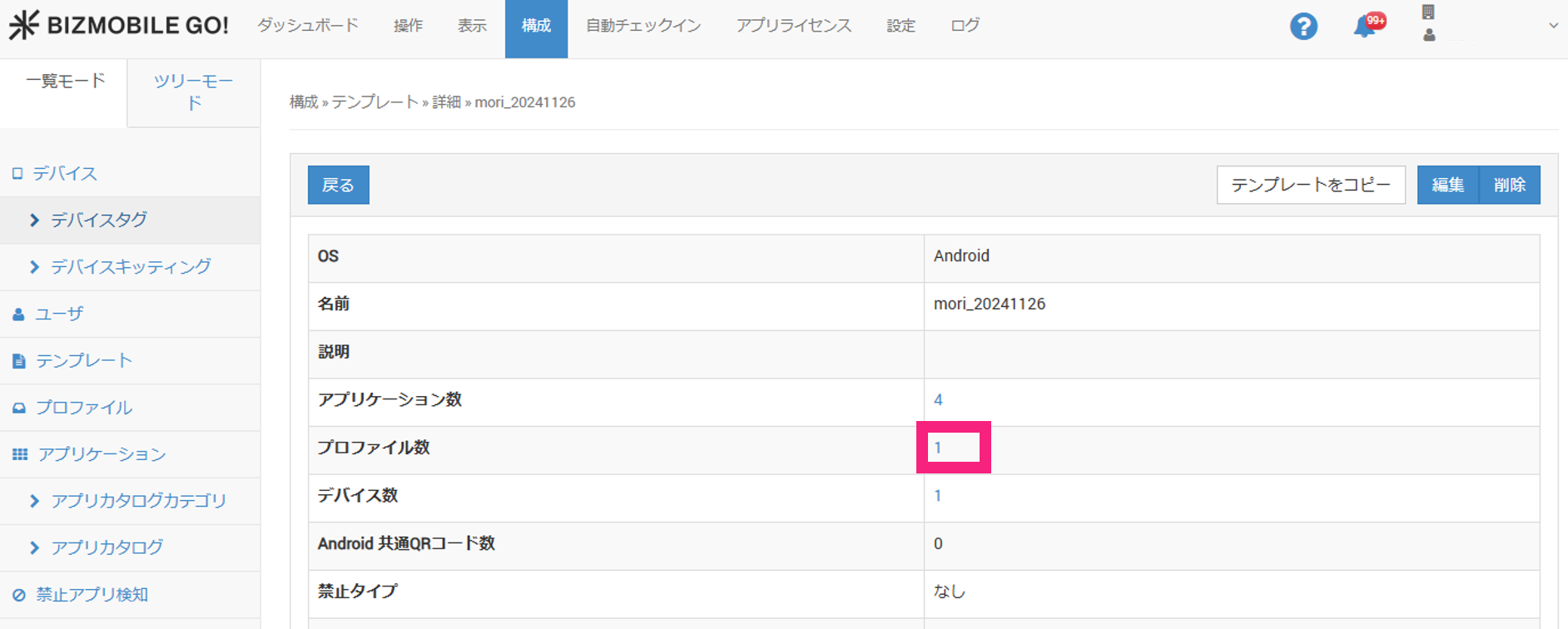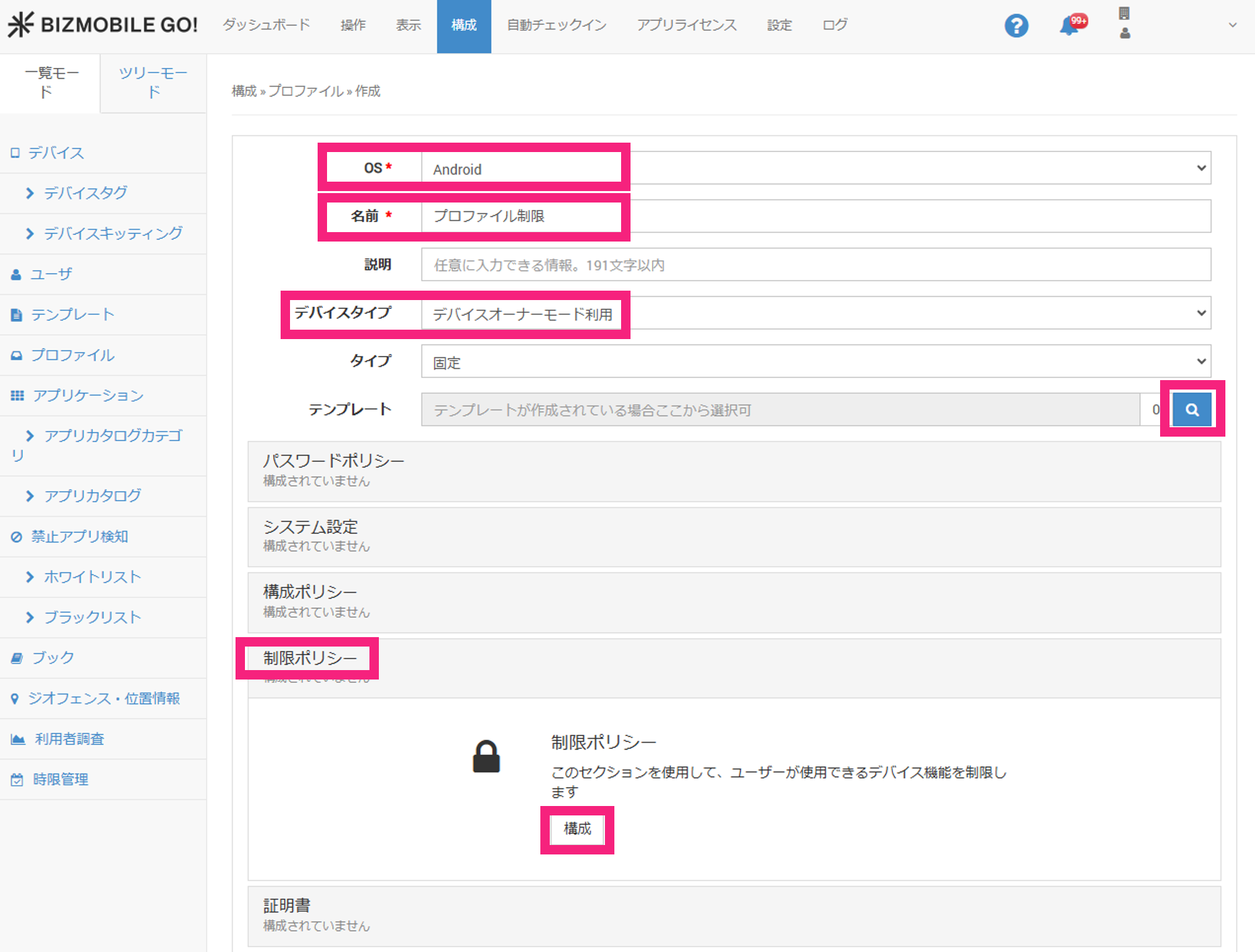 OSでAndroidを選択し名前を入力して、デバイスタイプを選択します。また適用するテンプレートがある場合にはテンプレートを登録します。