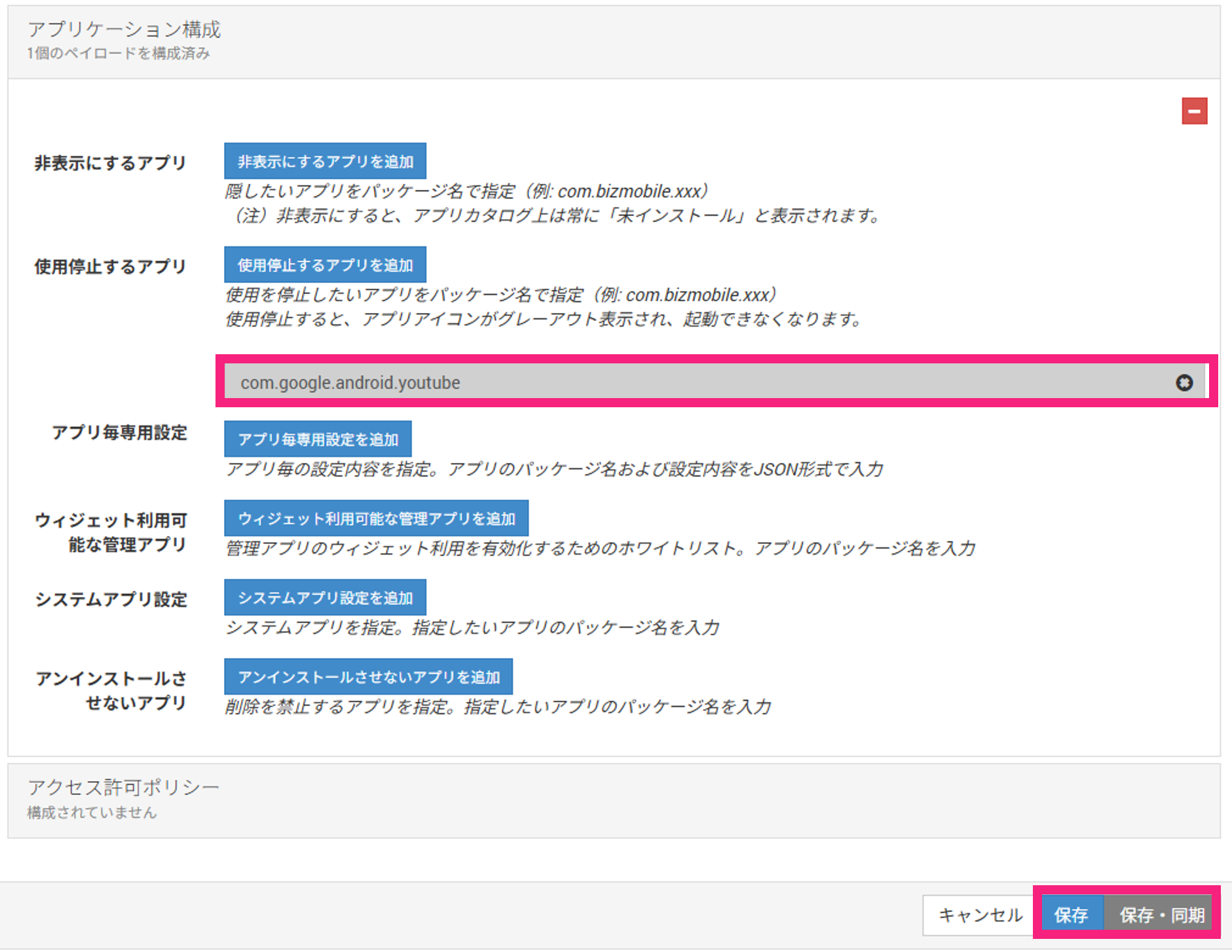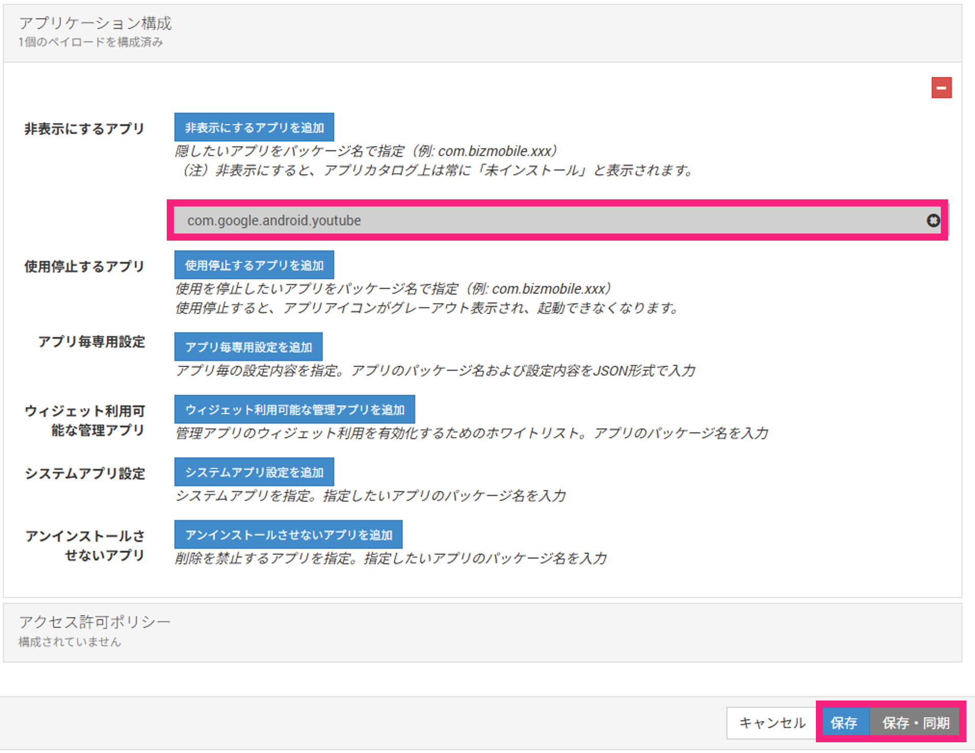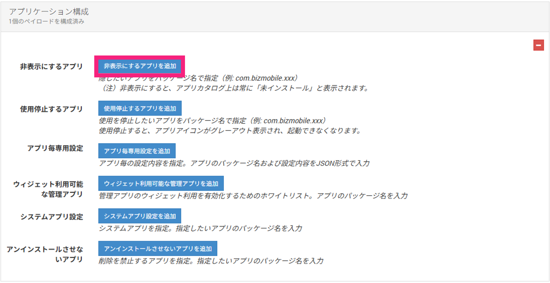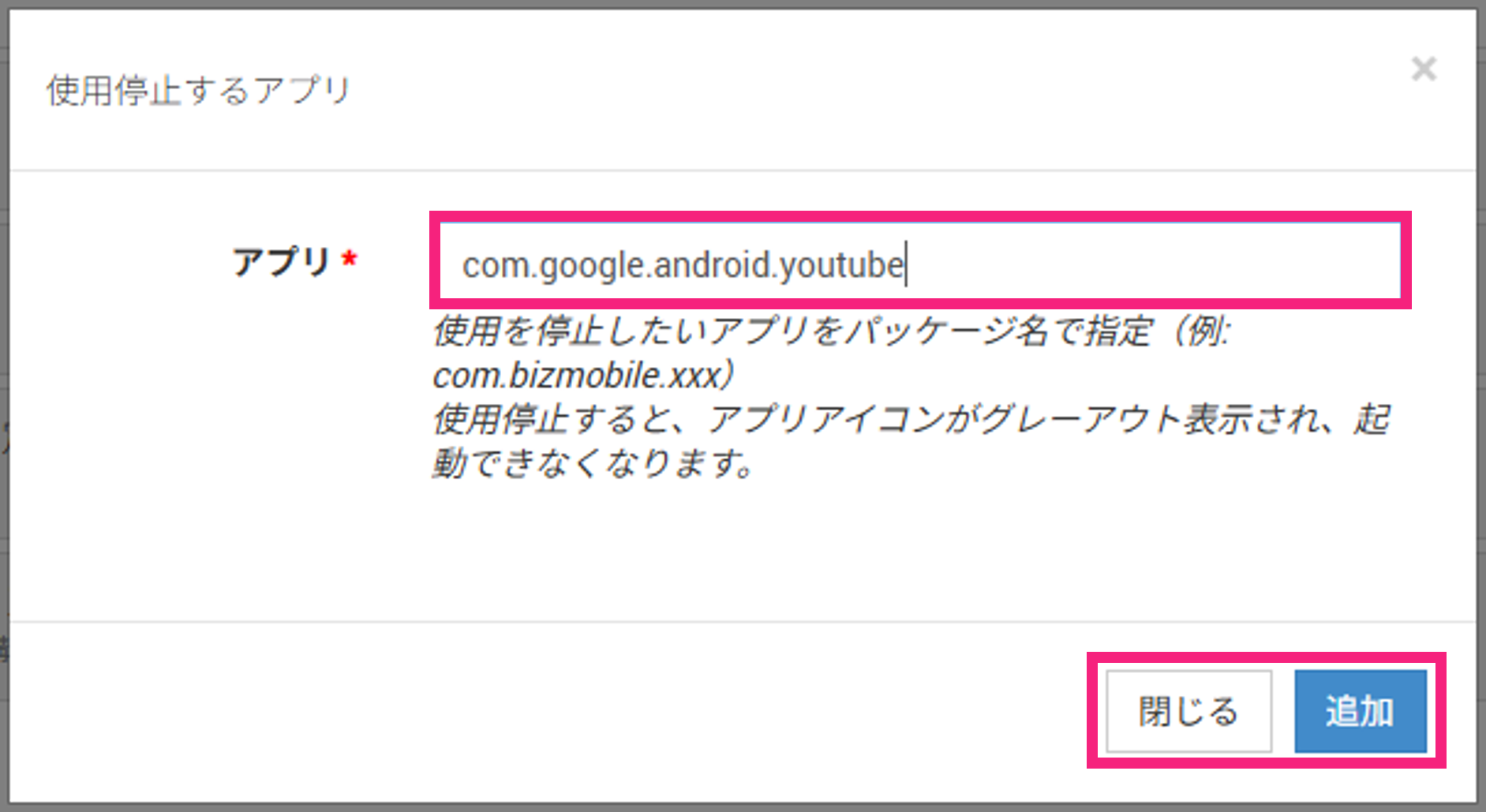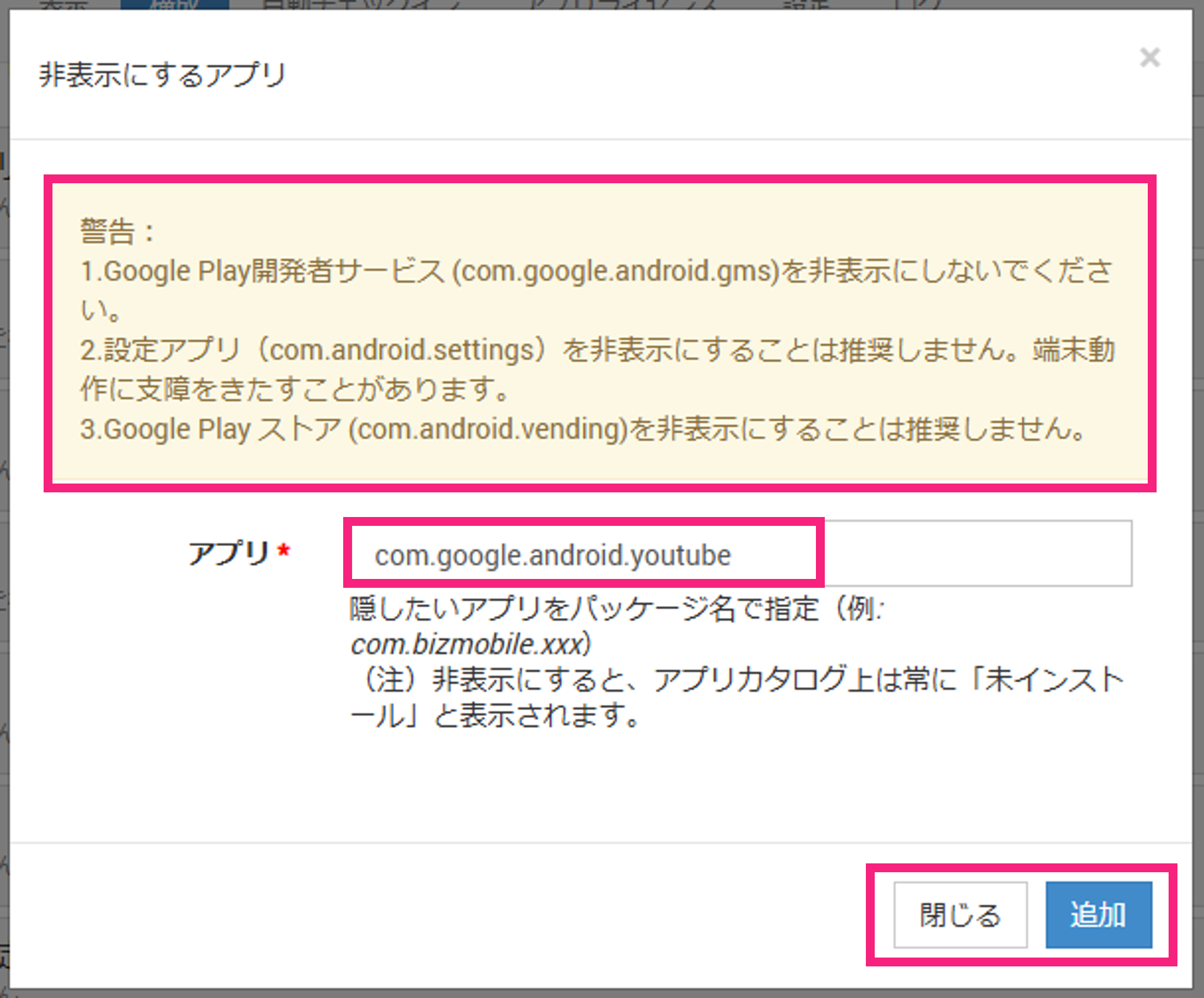 パッケージ名を登録し、追加→閉じるをクリックします。メモ:端末によっては非表示にしたシステムアプリにより他のアプリ動作に影響がでることがあります。複数に展開する場合は事前に検証機でテストを行ってください。