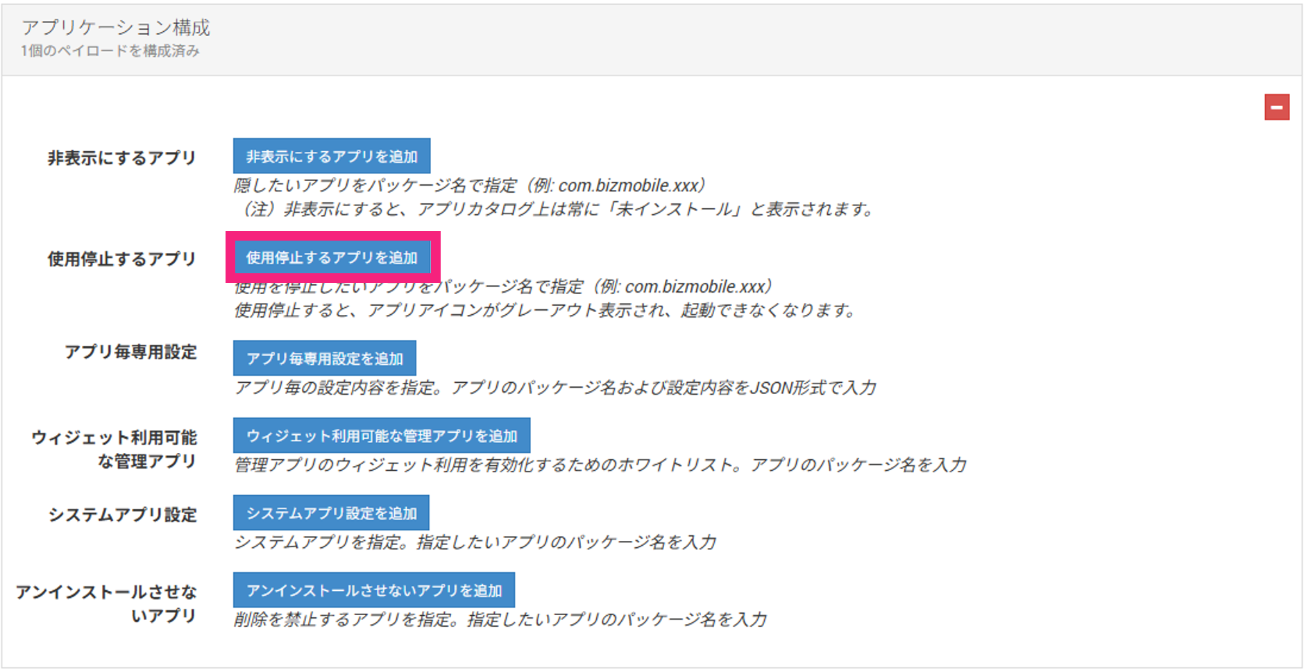 デバイスの詳細情報から、インストール済みアプリのパッケージ名を確認して登録することで、そのアプリをグレーアウトし使えない状態にします。