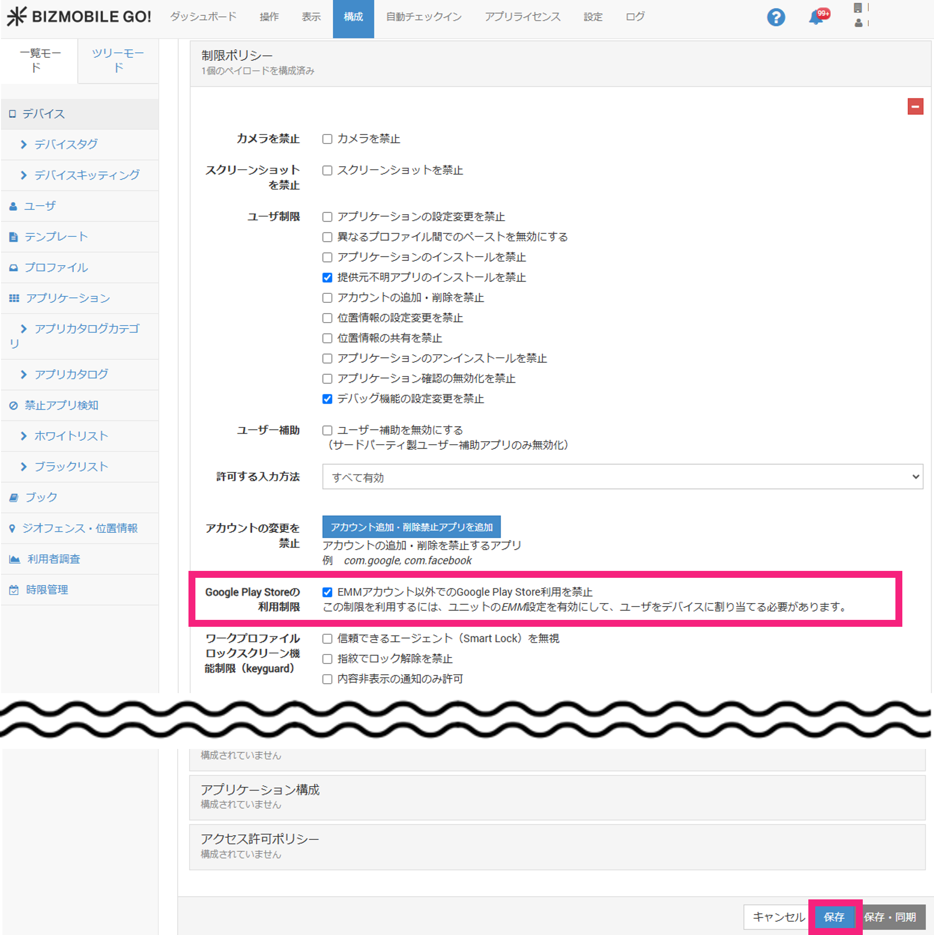 デバイスでユーザ操作による自由なアプリインストールができないようGoogle Play Storeの利用を制限する設定を行います。