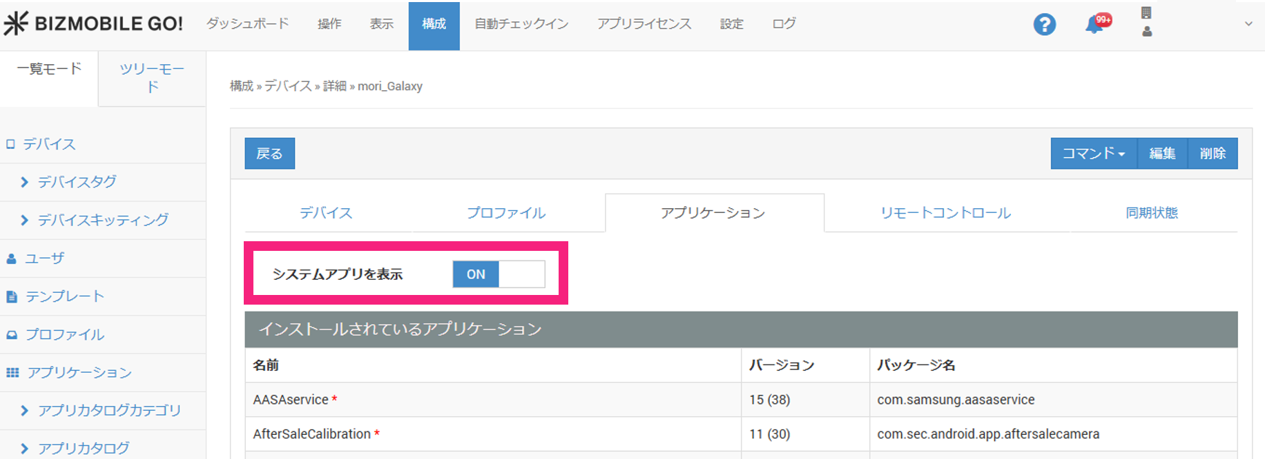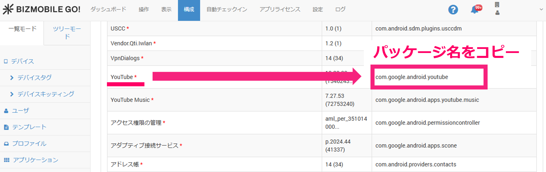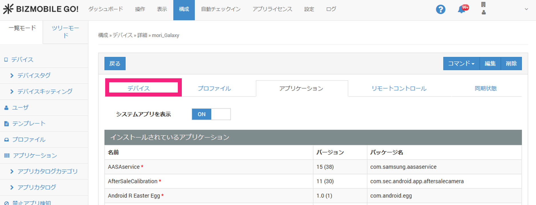 パッケージ名を確認しますので、操作 > 同期 のデバイス一覧からアプリの表示を制御するデバイスを選択します。