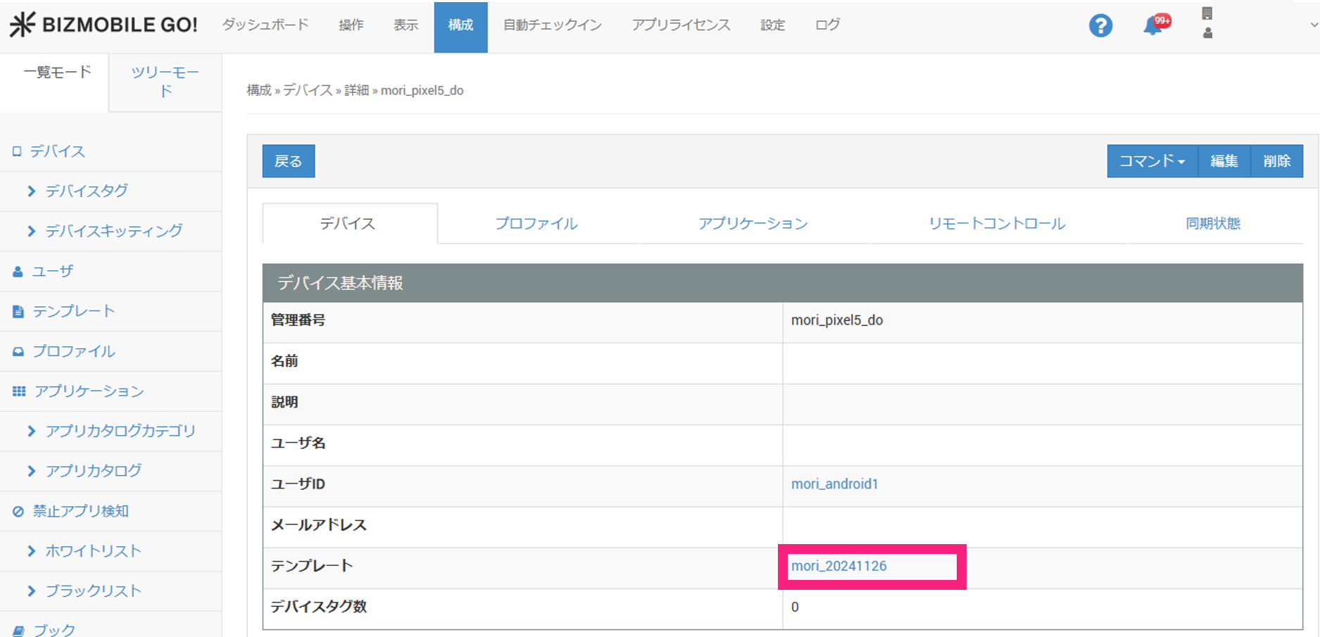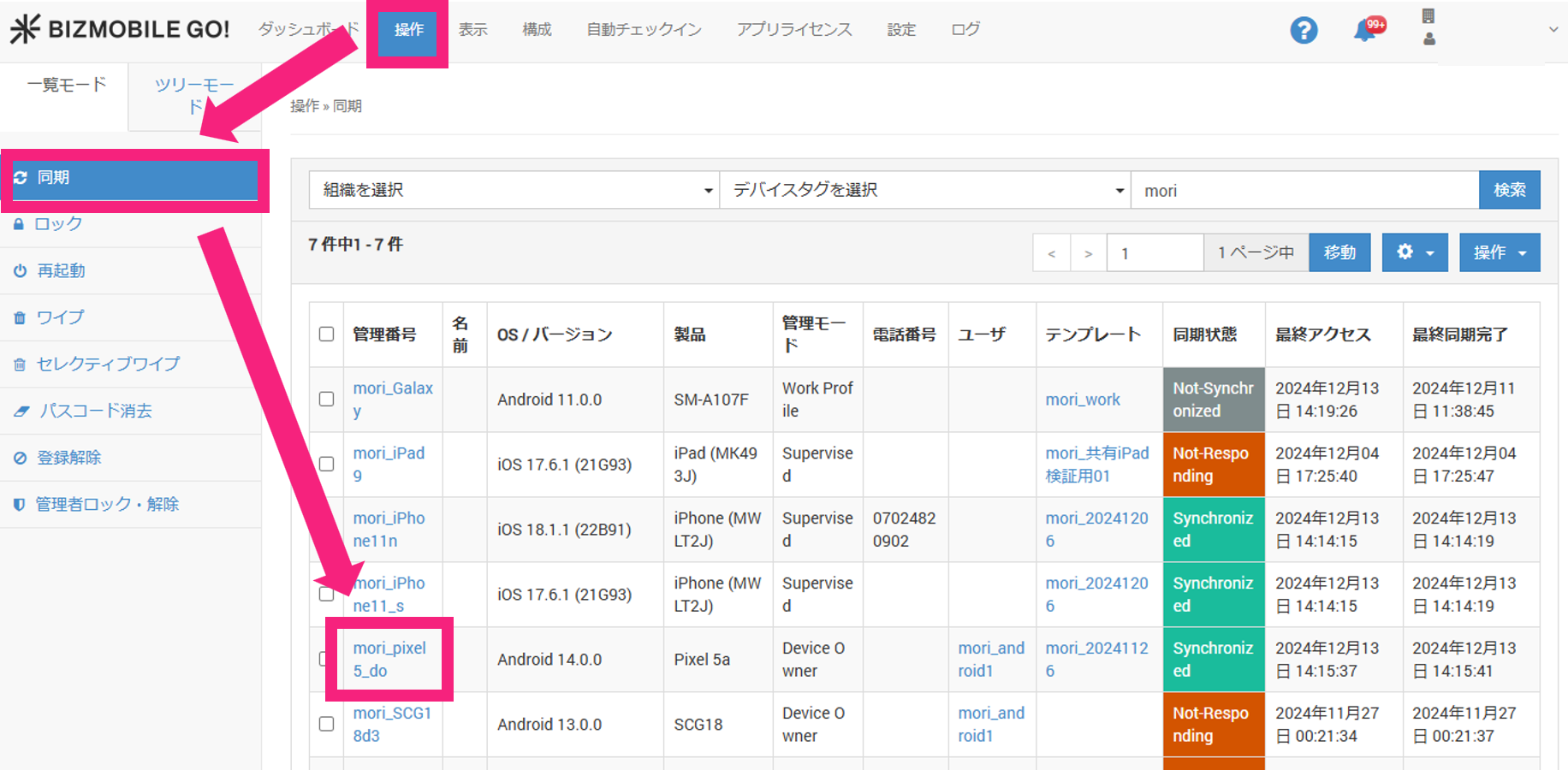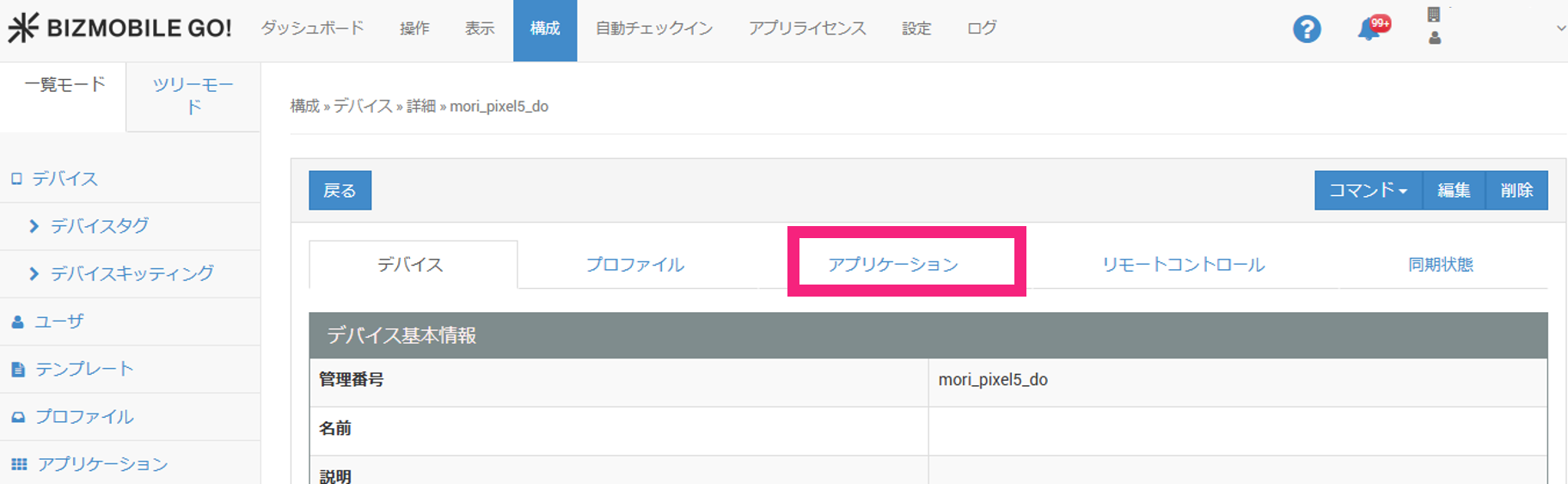 パッケージ名を確認しますので、操作 > 同期 のデバイス一覧からアプリの表示を制御するデバイスを選択します。