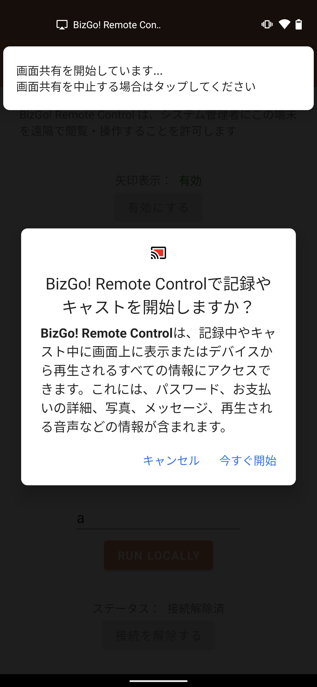 デバイスのアプリケーションが自動で立ち上がり、画面共有を開始するかどうかのポップアップが表示されますので、「今すぐ開始」をタップします。