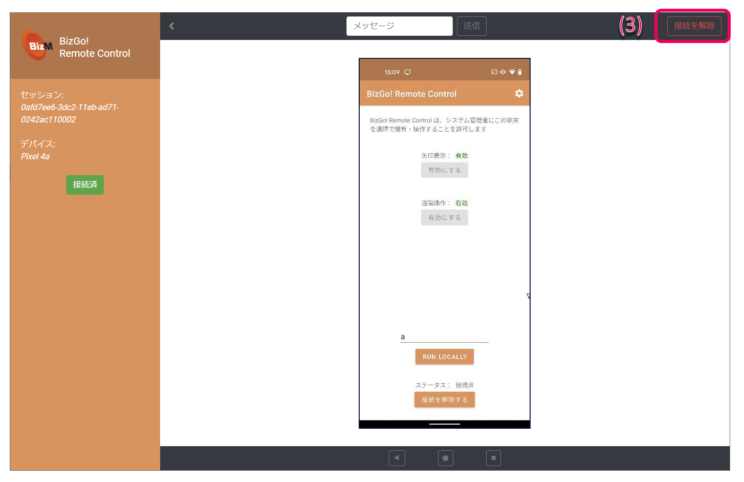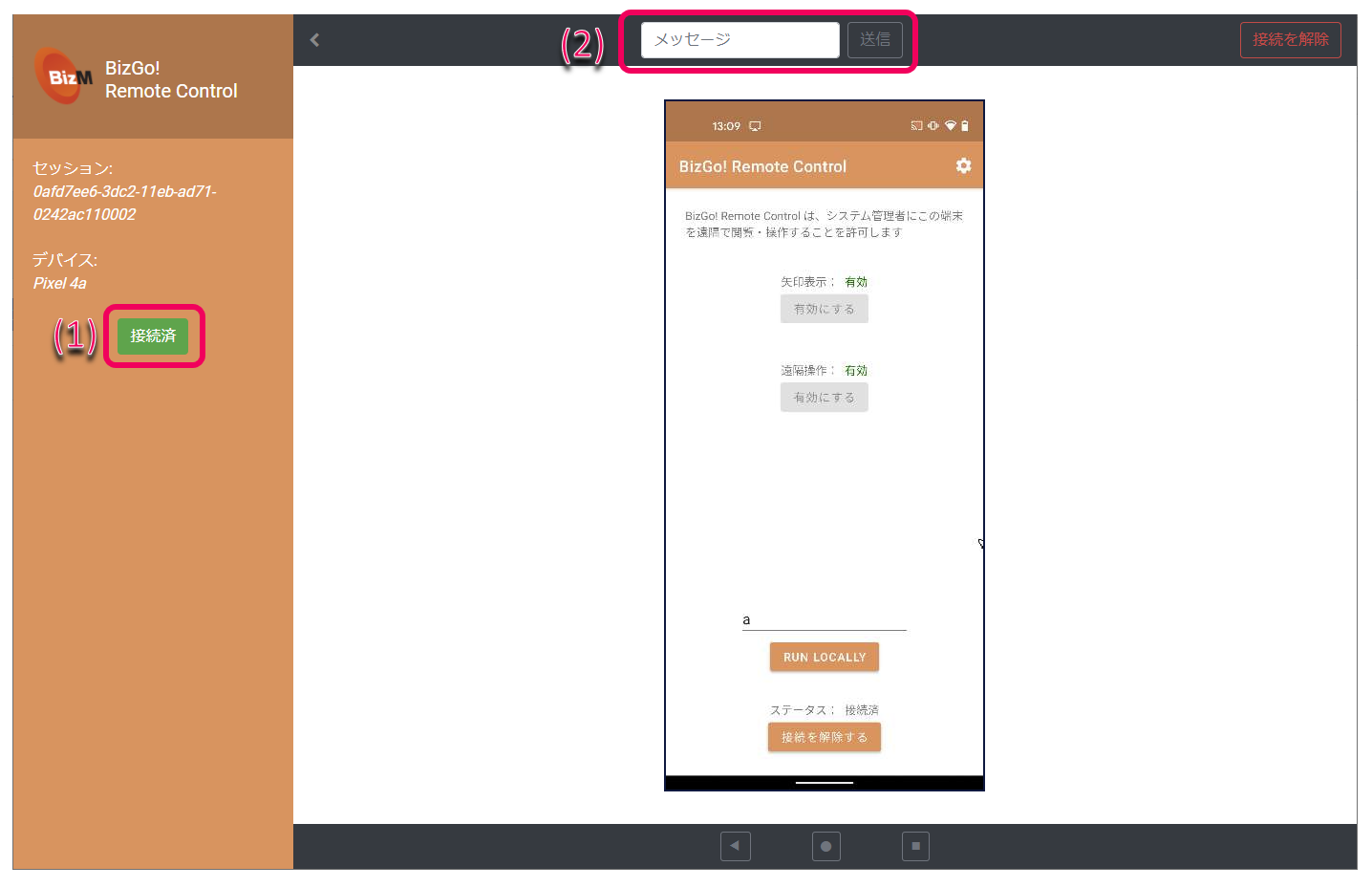 (1)「接続済」となり、デバイスの画面が共有されます。
