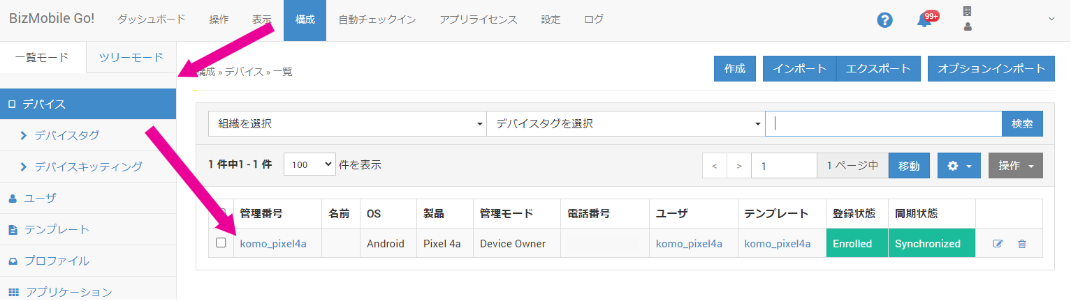 1. 【構成】→【デバイス】一覧より、画面共有をしたいデバイス名をクリックします。