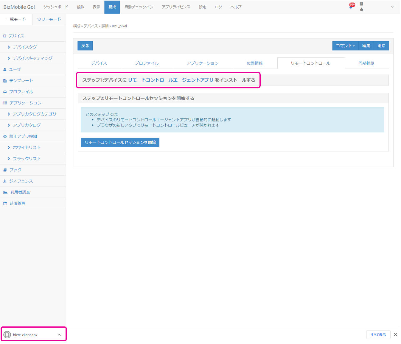3. 「ステップ1:デバイスにリモートコントロールエージェントアプリをインストールする」をクリックすると、最新版リモートコントロールエージェントアプリの.apkファイルがダウンロードされます。