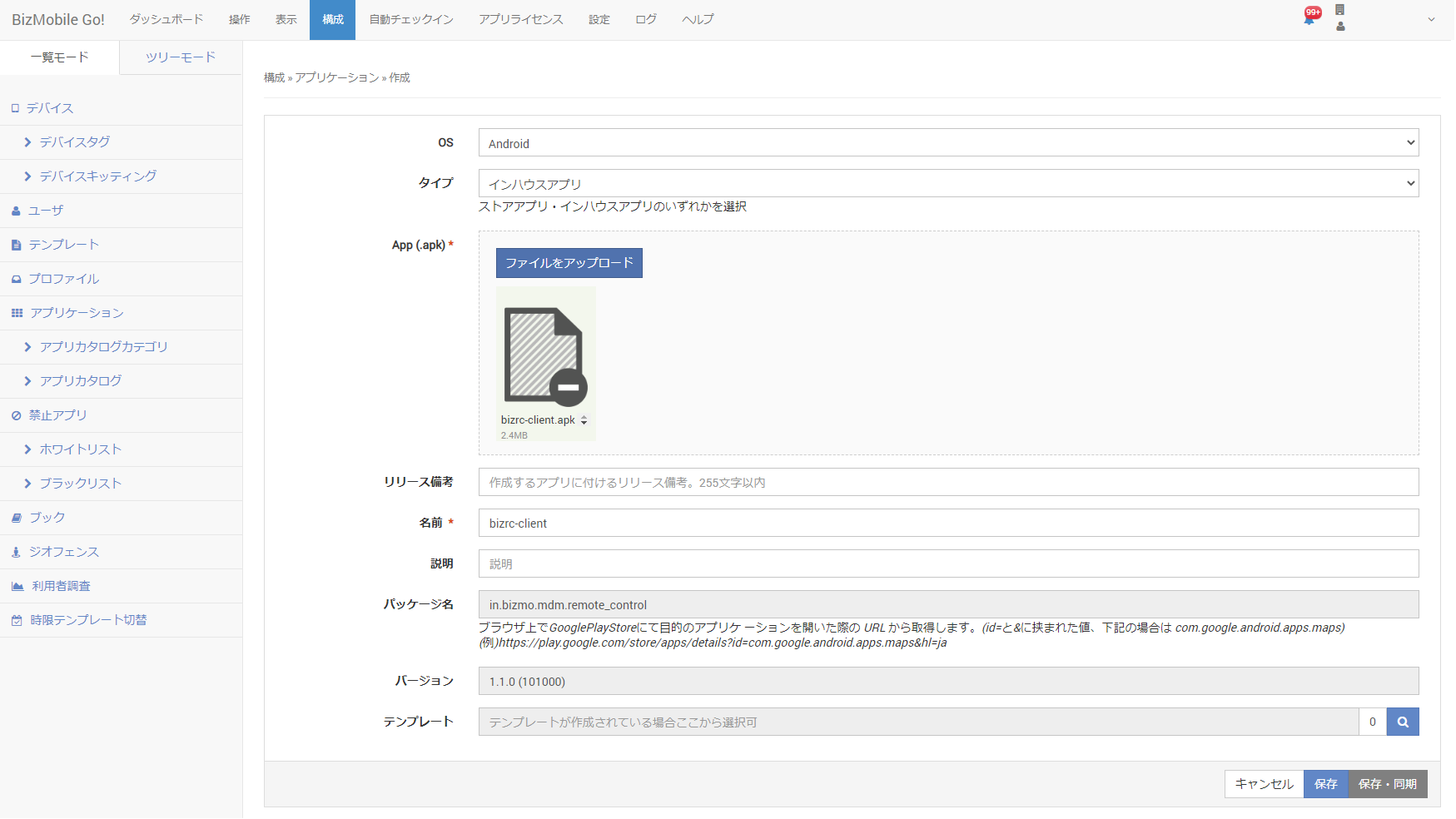 5. テンプレート作成画面にて、手順4で登録したインハウスアプリを任意のテンプレートに登録し、デバイスへ配付してインストールします。