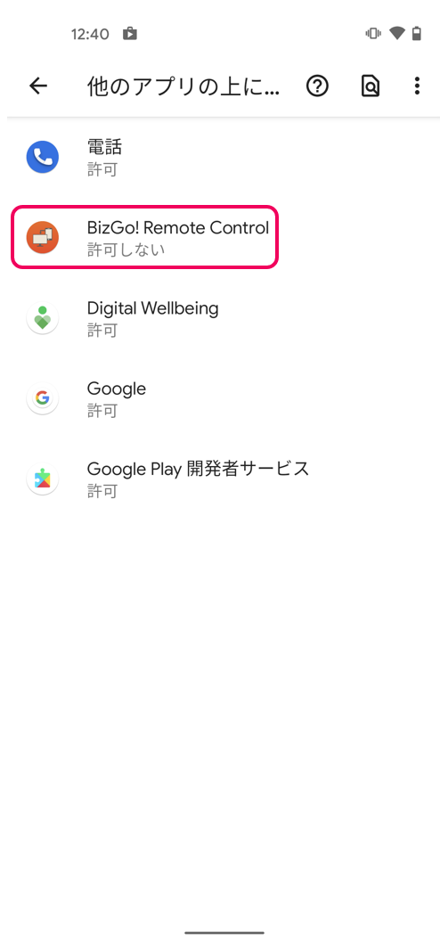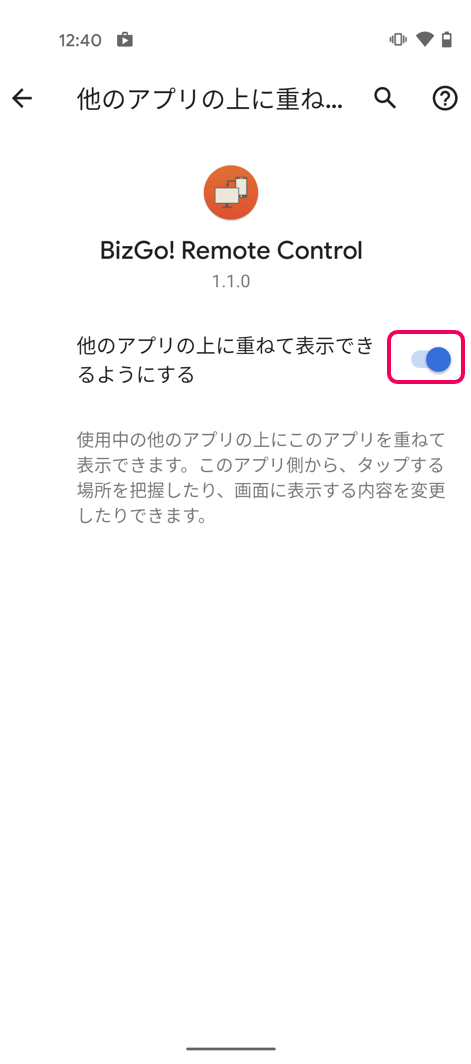 初期値では、「他のアプリの上に重ねて表示できるようにする」が「許可しない」設定になっているので「許可する」にします。