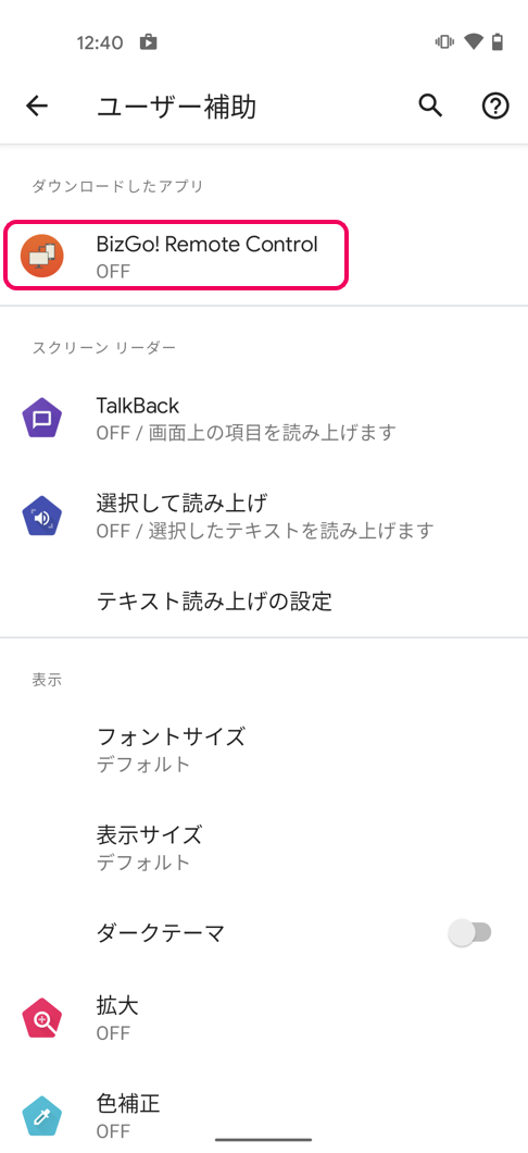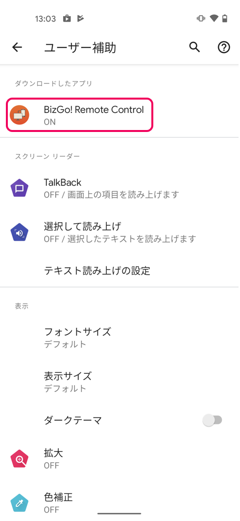 2. 矢印表示を「有効にする」をタップし、続いてBizGo! Remote Controlをタップします。