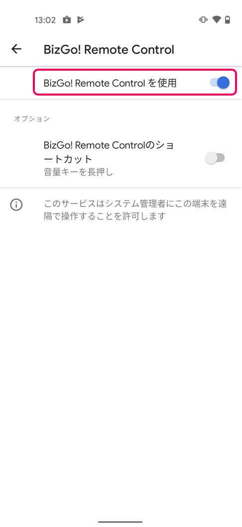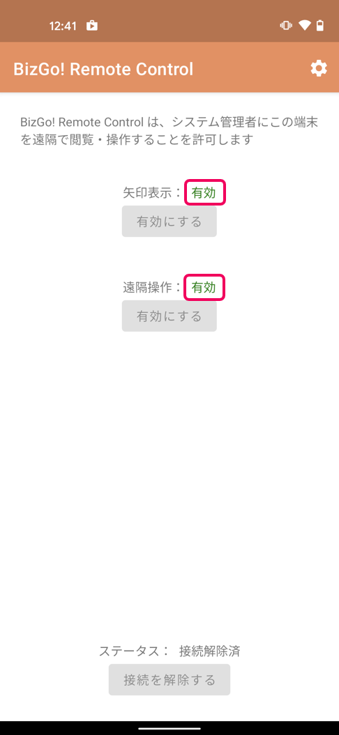 5. BizGo! Remote Controlの画面より、2つの設定が「有効」になったことを確認します。