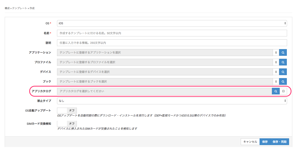 テンプレート作成/編集画面から、作成したアプリカタログ情報の割り当てを行います。