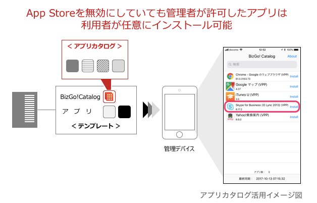 アプリカタログは、デバイスの利用者が自由にインストール可能な許可アプリあるいは推奨アプリのリストを作成する機能と、作成したアプリリストをデバイスにダウンロードし、任意のタイミングで、デバイスの利用者がアプリのダウンロード(インストール)を可能とする機能とで構成されています。