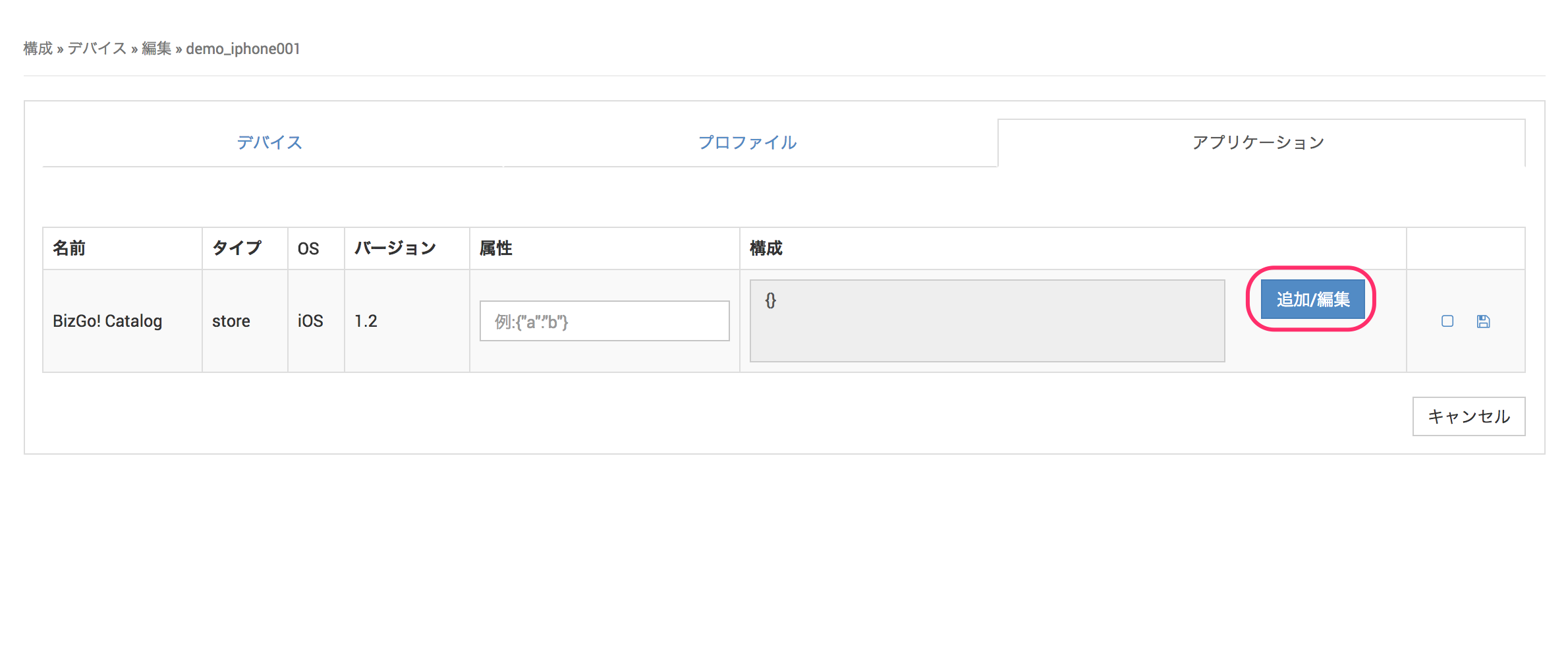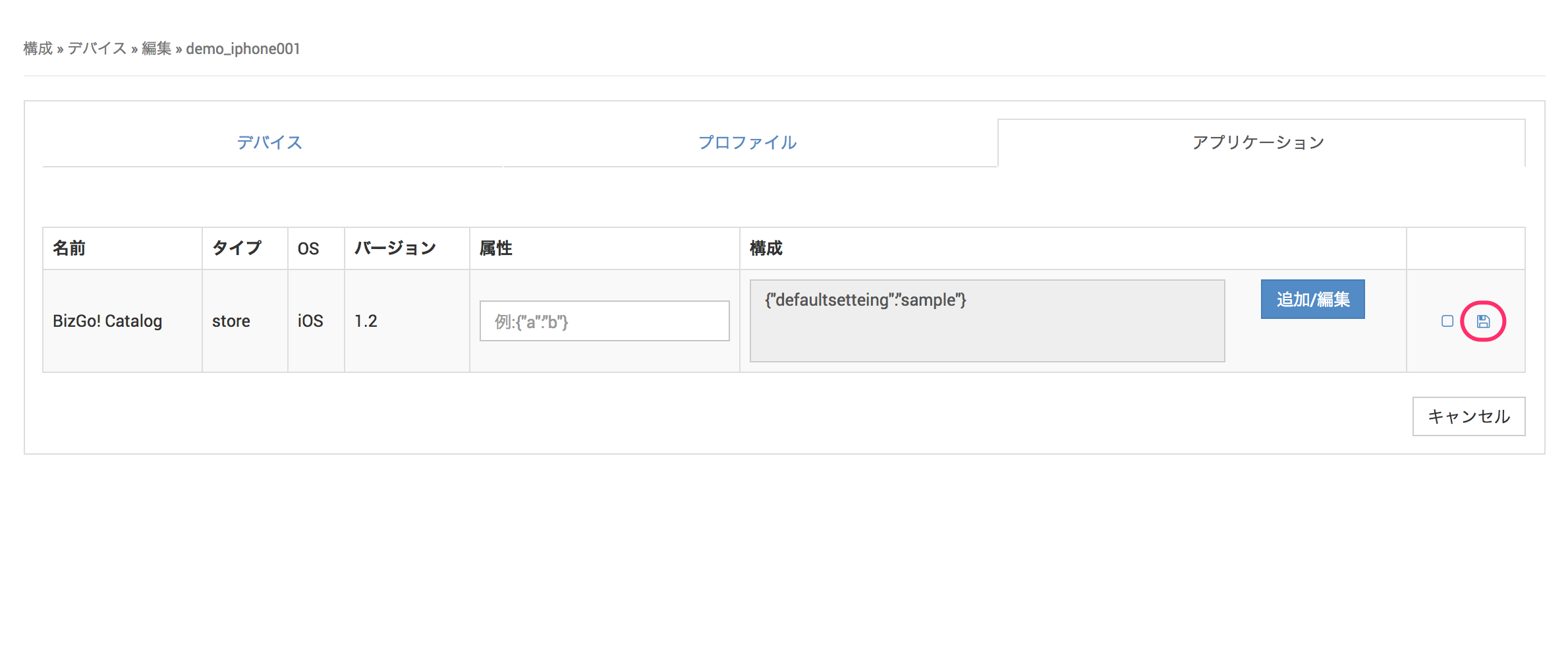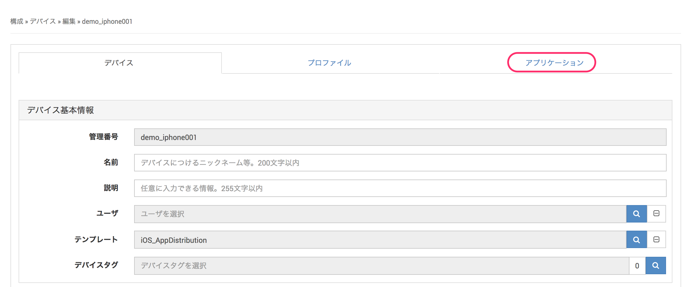 1. デバイス編集画面にて、アプリケーションをクリックします。