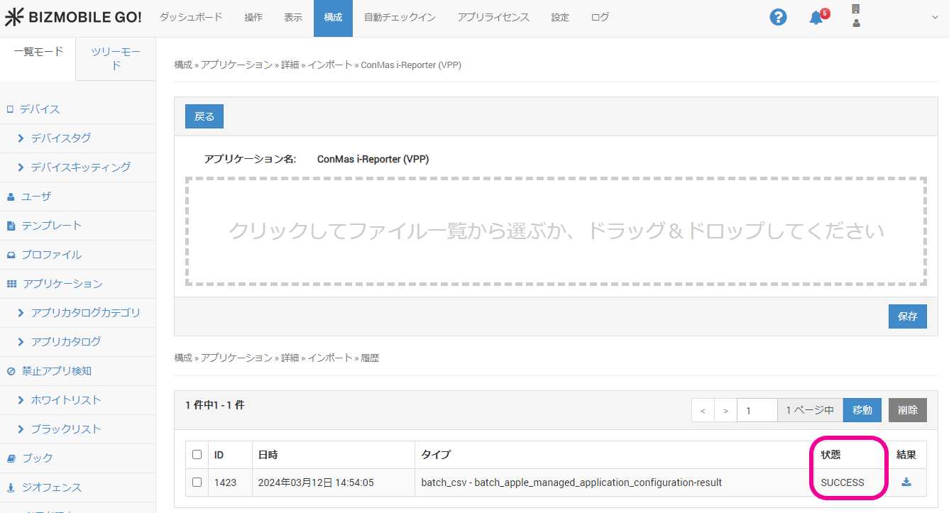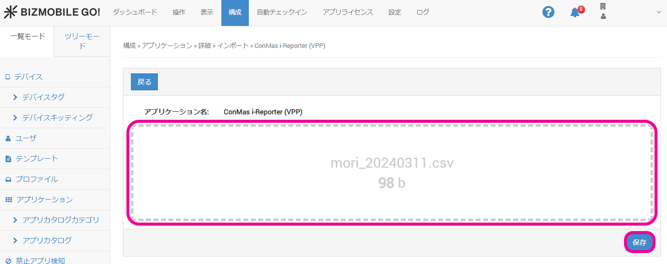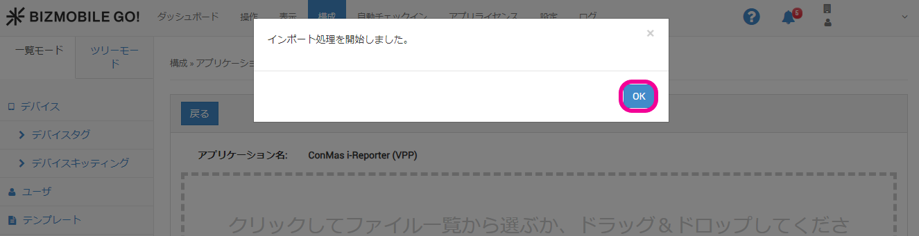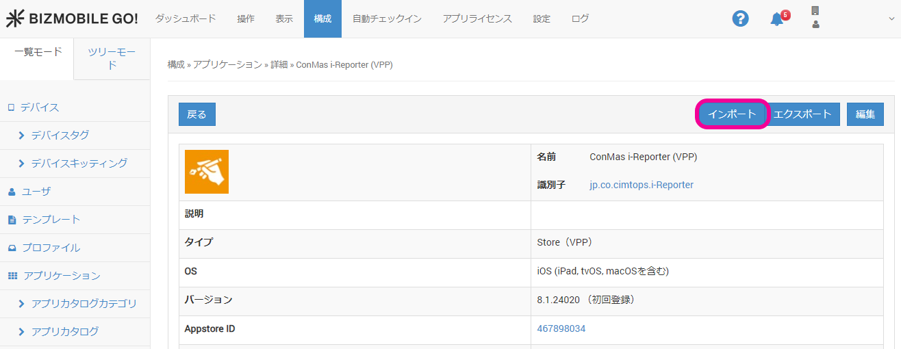 2. 構成 > アプリケーション のアプリ詳細画面にて、インポートをクリックします。