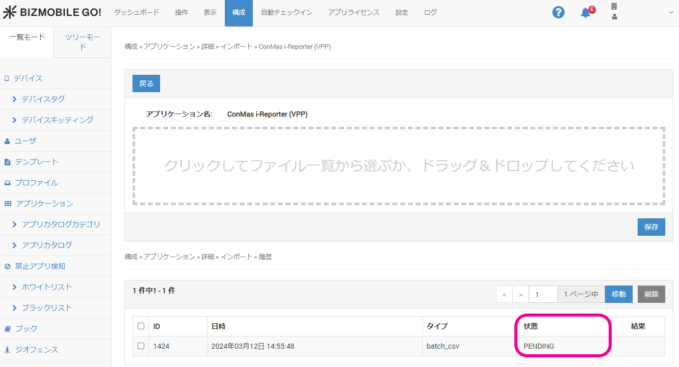 5. インポート履歴に状態がPENDINGと表示されたら、少し時間をおいてブラウザを更新してください。
